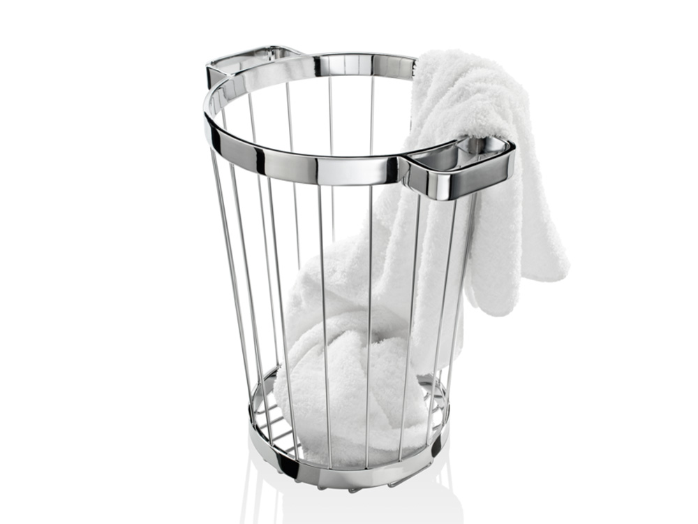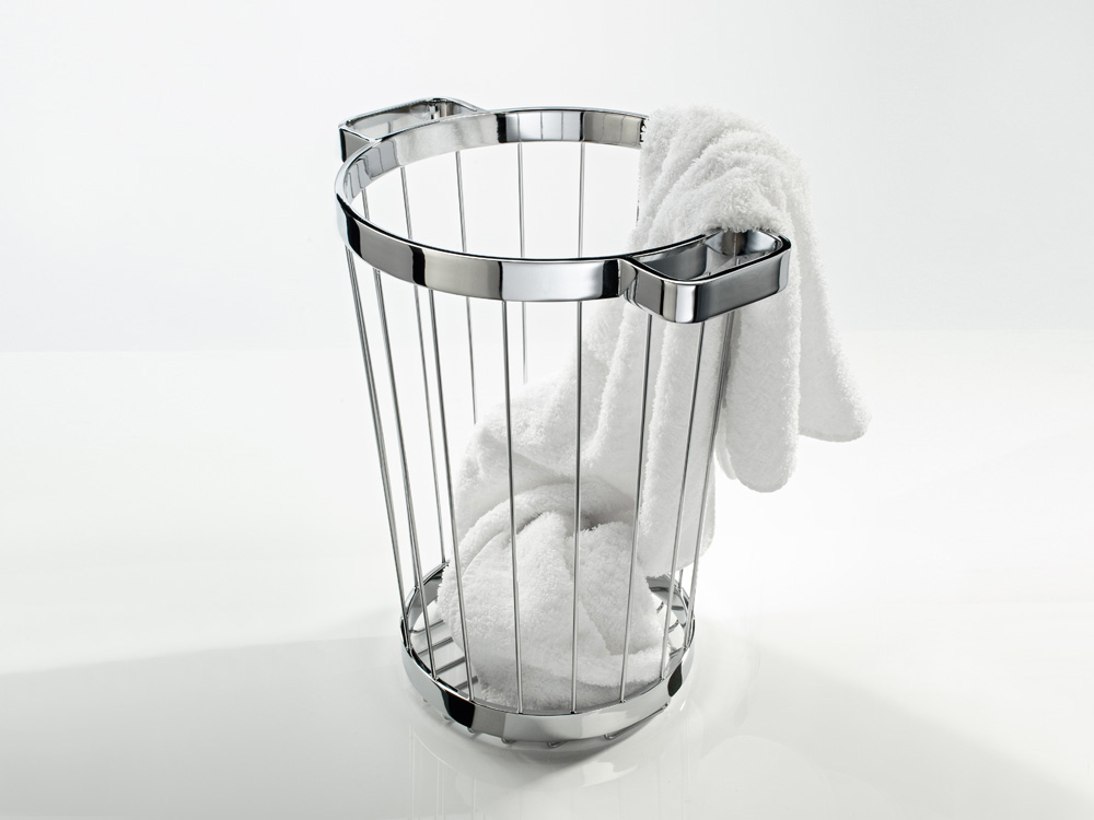 Elegancki łazienkowy podręczny kosz na ręczniki i bieliznę wykonany z wysokiej jakości chromowanego mosiądzu.