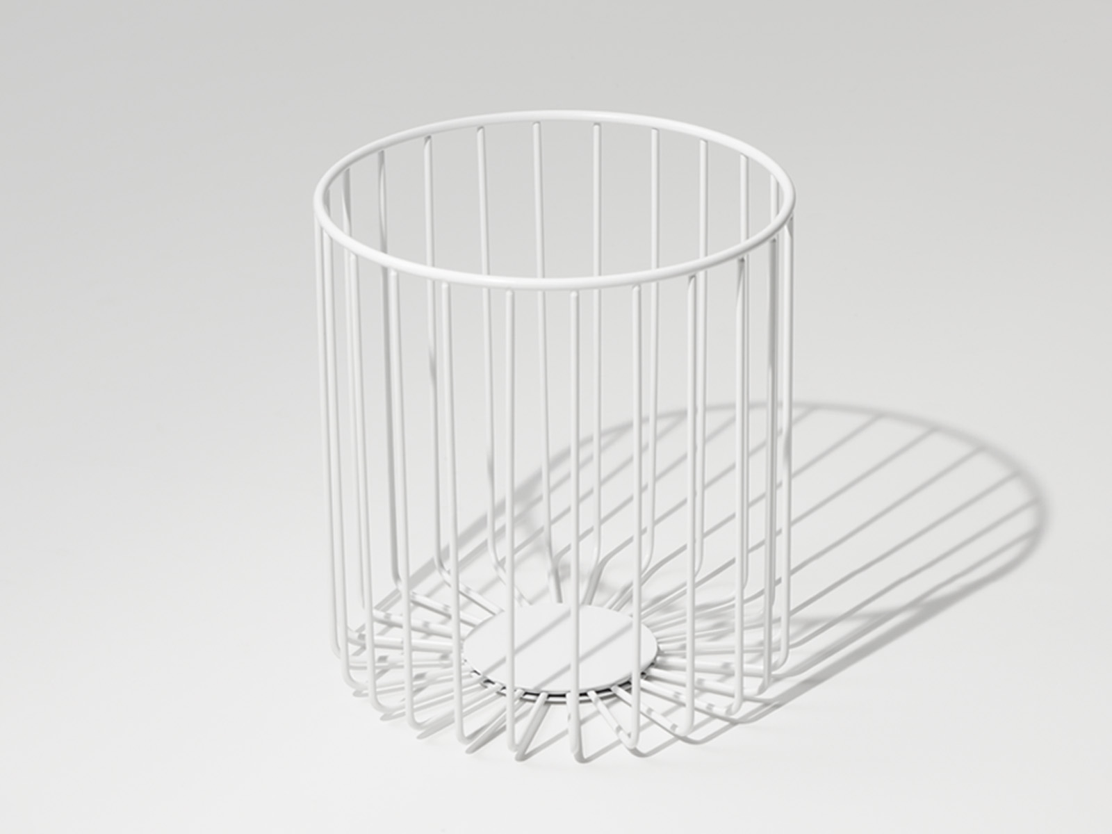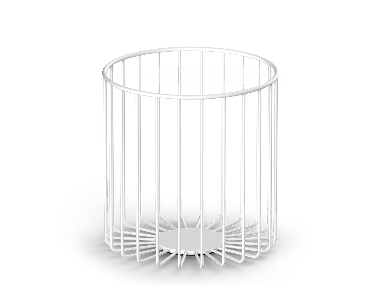 Elegancki łazienkowy podręczny kosz na ręczniki i bieliznę o okrągłej ażurowej konstrukcji z promieniście rozchodzącymi się od podstawy prętami.