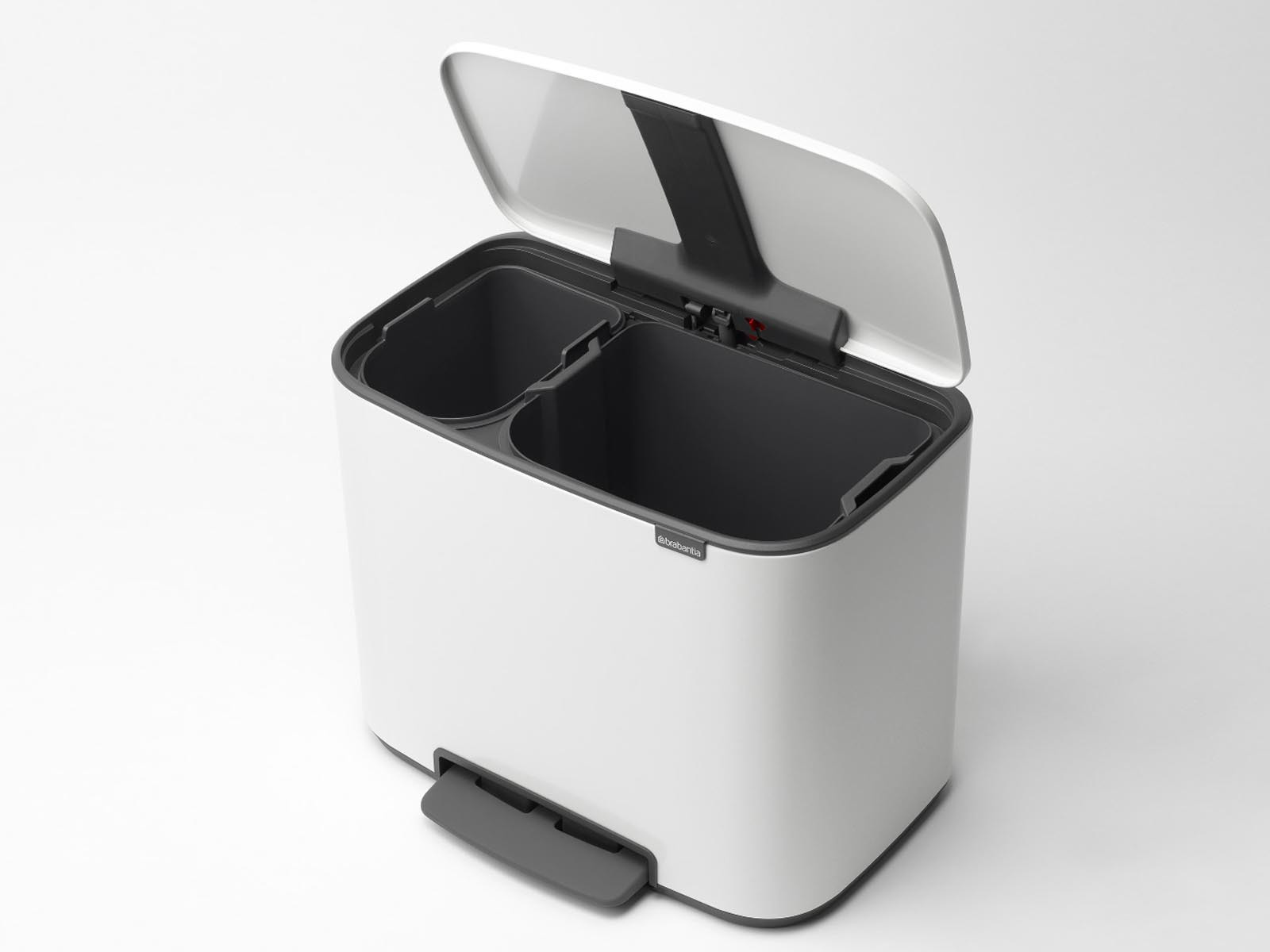 Kosz posiada dwie różnej wielkości komory z wewnętrznymi plastikowymi pojemnikami o pojemności 11 litrów oraz 23 litry (w sumie 34 litry), które można swobodnie wyjąć podczas opróżniania go i wymiany worków.