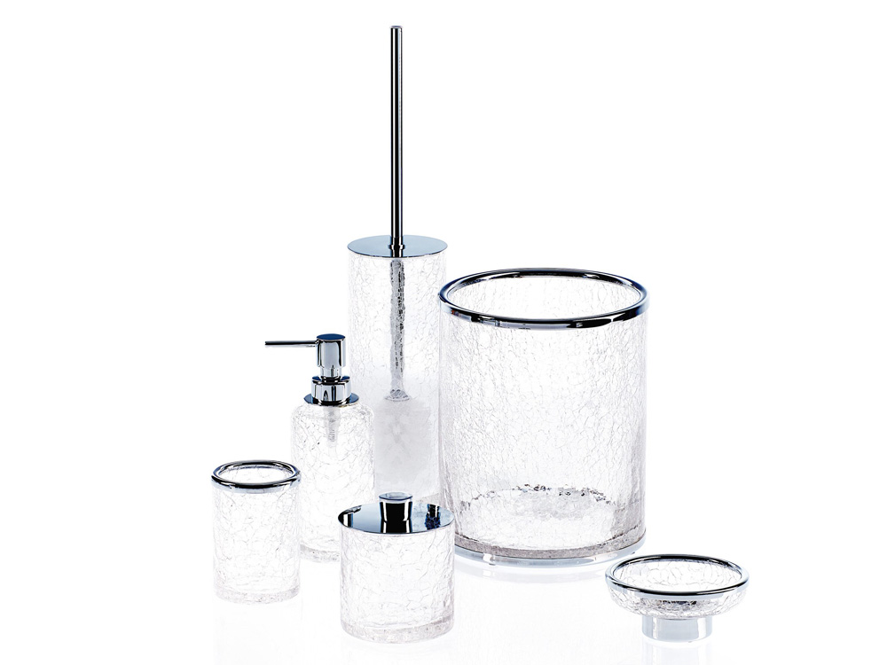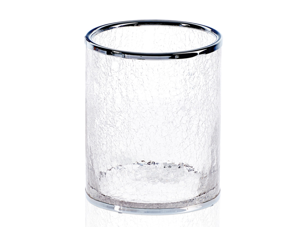 Elegancki okrągły otwarty kosz na śmieci wykonany z niezwykle dekoracyjnego przezroczystego szkła "tłuczonego" o charakterystycznym wzorze przypominającym gęstą siatkę pęknięć.