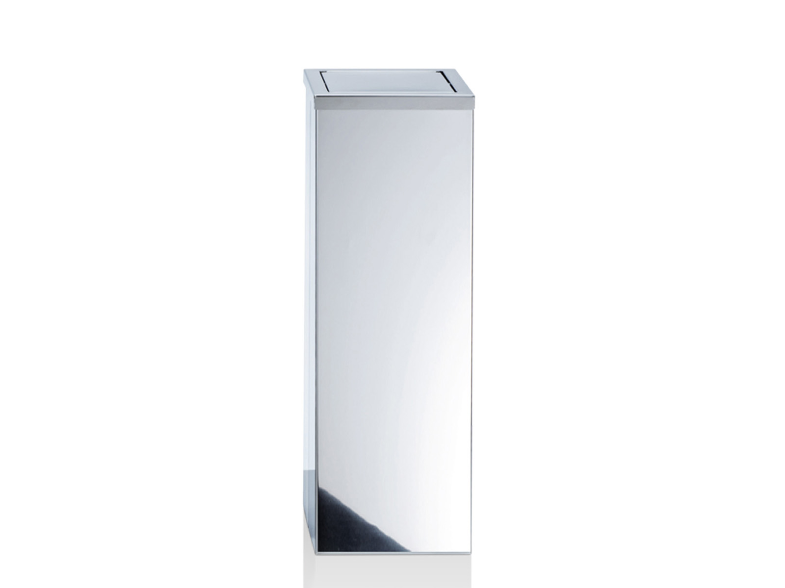 Elegancki wysoki łazienkowy kosz na śmieci o prostokątnym kształcie, wykonany z polerowanej stali nierdzewnej.