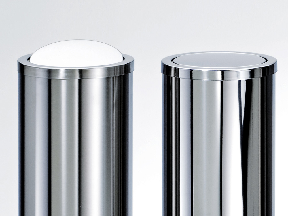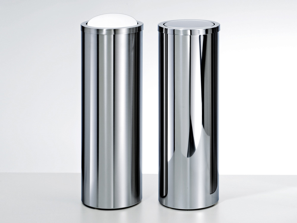 Elegancki wysoki łazienkowy kosz na śmieci o cylindrycznym kształcie, wykonany z matowej stali nierdzewnej.