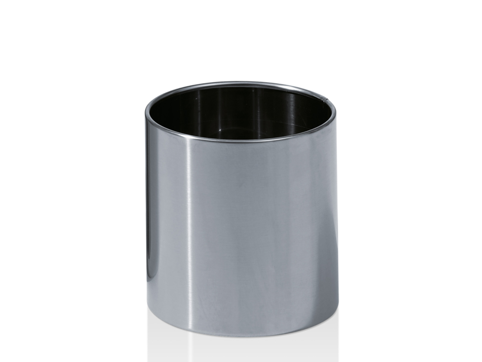 Elegancki otwarty niewysoki kosz na śmieci o cylindrycznym kształcie wykonany z wysokiej jakości polerowanej stali nierdzewnej.