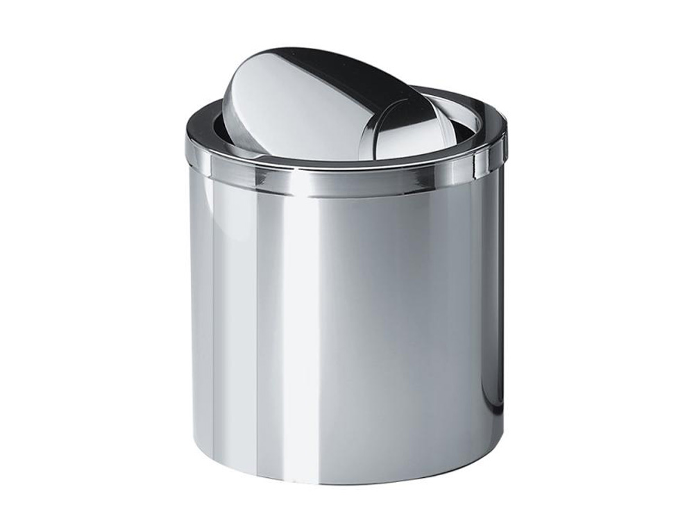 Elegancki niewysoki łazienkowy kosz na śmieci o cylindrycznym kształcie, wykonany z polerowanej stali nierdzewnej.