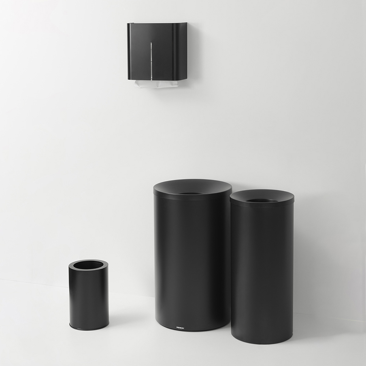 Elegancki wysoki smukły kosz na śmieci o cylindrycznym kształcie wykonany z wysokiej jakości lakierowanej stali nierdzewnej w wykończeniu matowym.