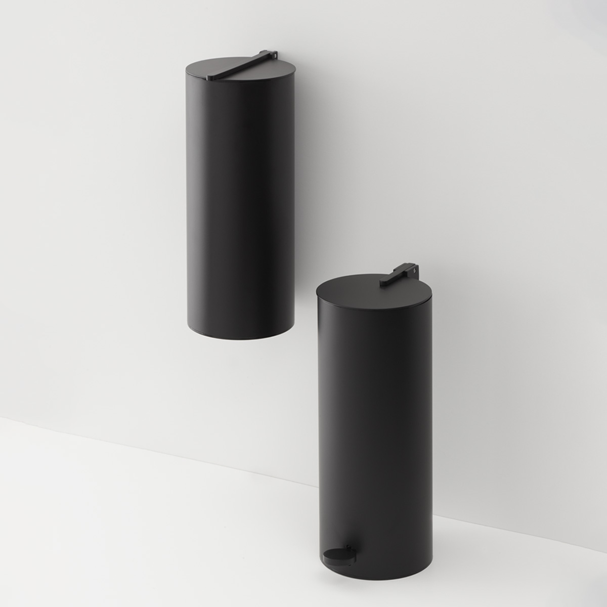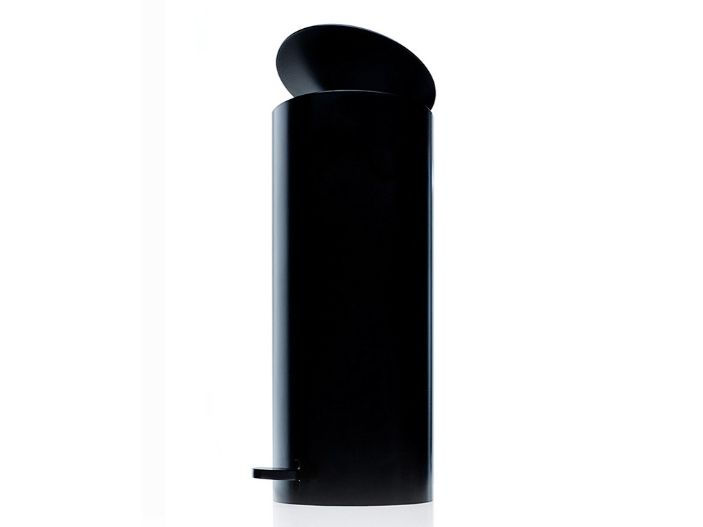 Elegancki łazienkowy kosz na śmieci o smukłym cylindrycznym kształcie automatycznie otwierany poprzez naciskany stopą pedał.