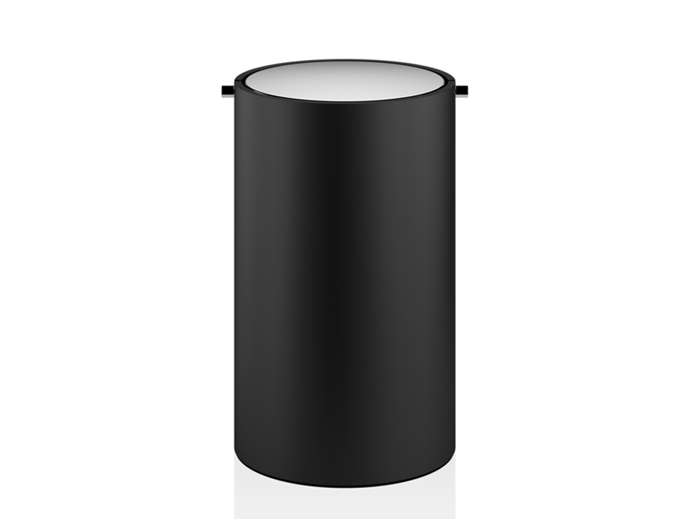 Elegancki wolnostojący zamykany kosz na śmieci o cylindrycznym kształcie wykonany z innowacyjnego, odpornego na uszkodzenia a zarazem przyjaznego dla środowiska kompozytu mineralnego.