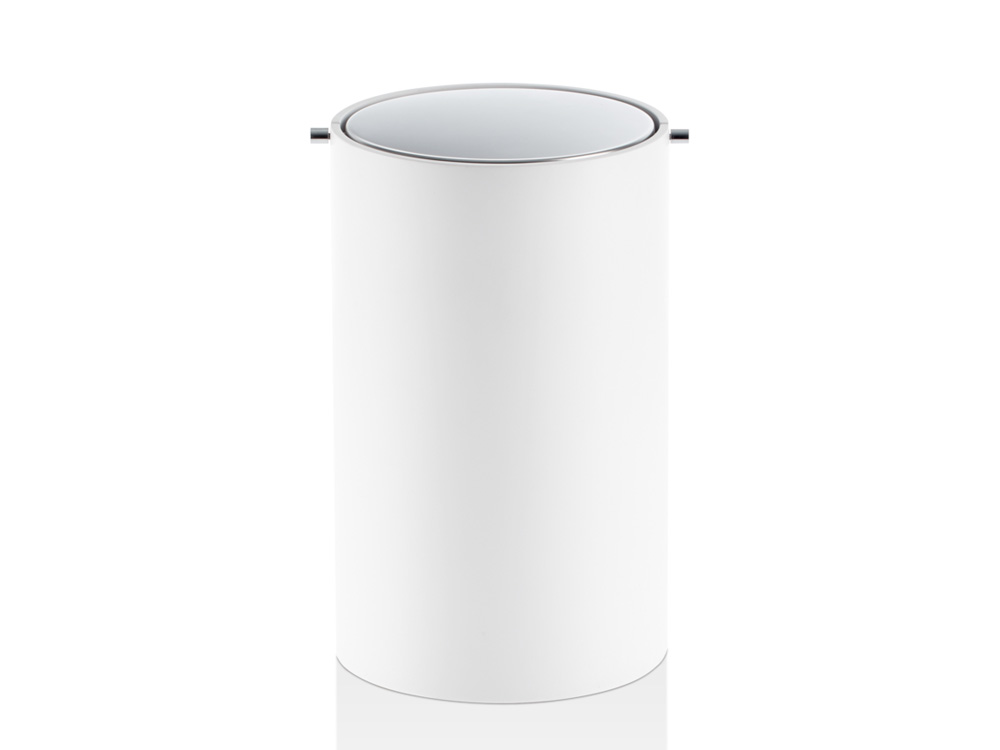 Elegancki wolnostojący zamykany kosz na śmieci o cylindrycznym kształcie wykonany z innowacyjnego, odpornego na uszkodzenia a zarazem przyjaznego dla środowiska kompozytu mineralnego.