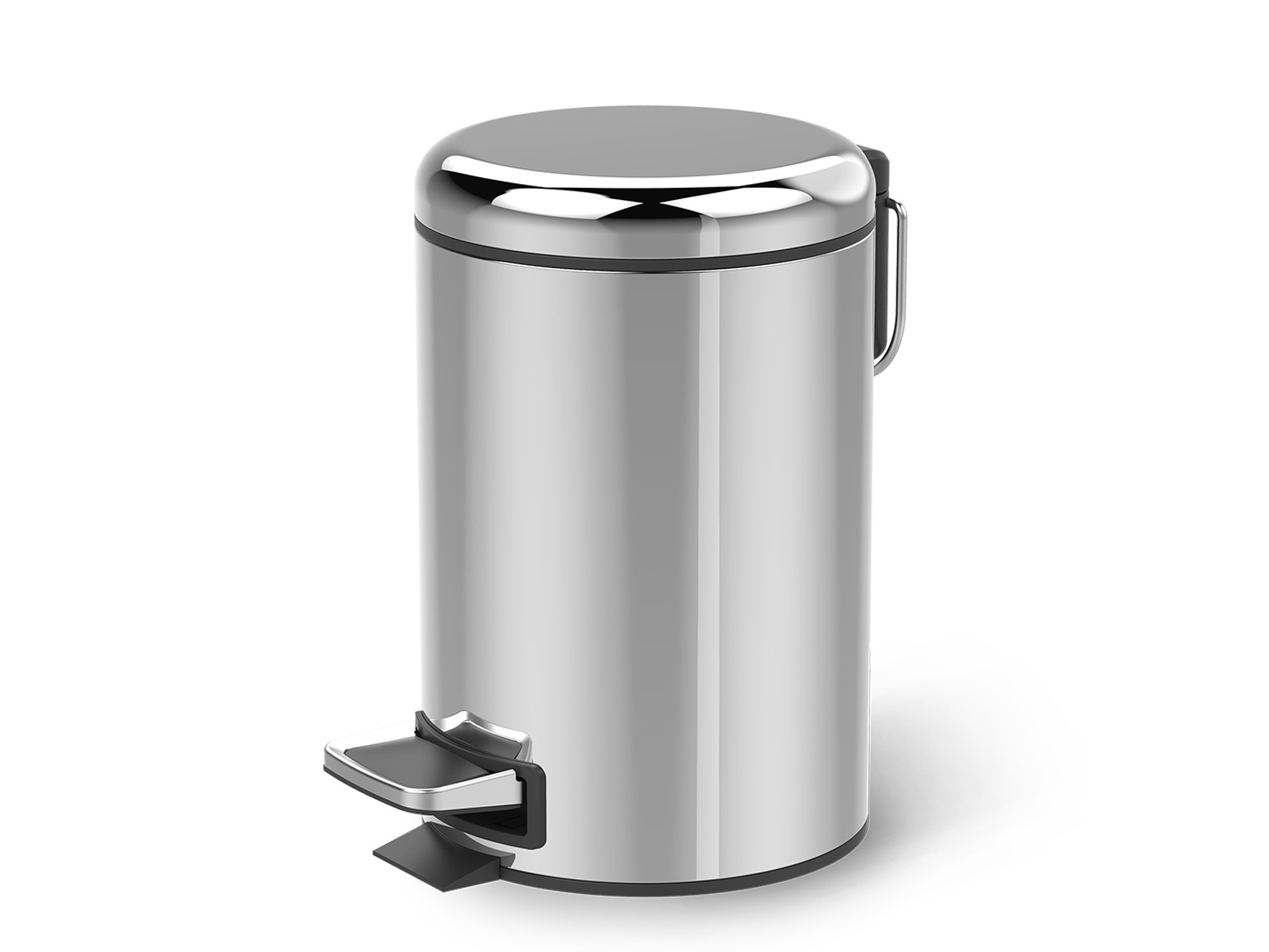Elegancki łazienkowy kosz na śmieci o cylindrycznym kształcie z klapą automatycznie otwieraną poprzez naciskany stopą pedał.