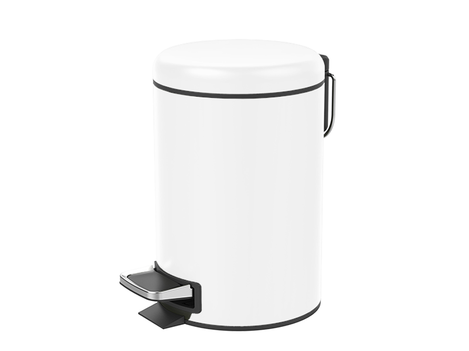 Elegancki łazienkowy kosz na śmieci o cylindrycznym kształcie z klapą automatycznie otwieraną poprzez naciskany stopą pedał.