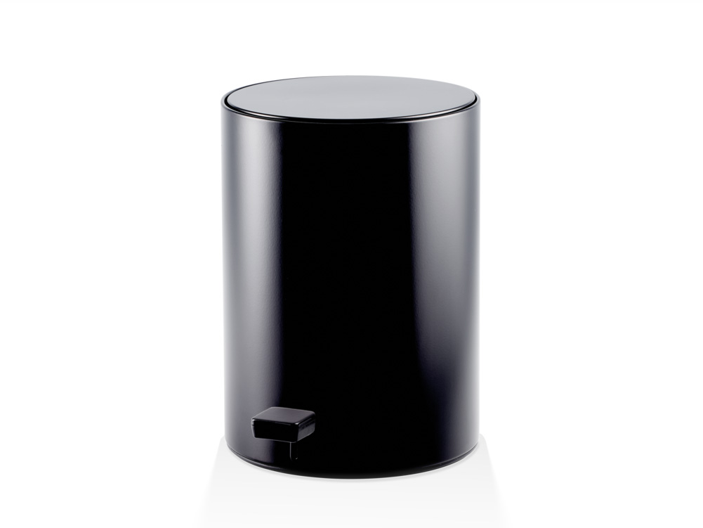 Elegancki łazienkowy kosz na śmieci o cylindrycznym kształcie otwierany automatycznie poprzez naciskany stopą pedał.