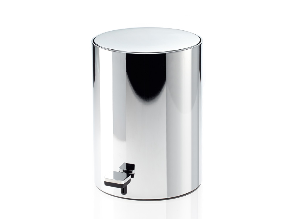 Elegancki łazienkowy kosz na śmieci o cylindrycznym kształcie otwierany automatycznie poprzez naciskany stopą pedał.