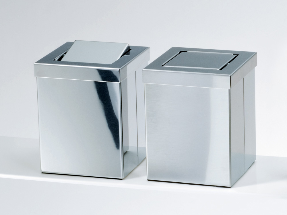 Elegancki nablatowy niewielki kosz na śmieci o prostokątnym kształcie wykonany z wysokiej jakości stali nierdzewnej w wykończeniu matowym.