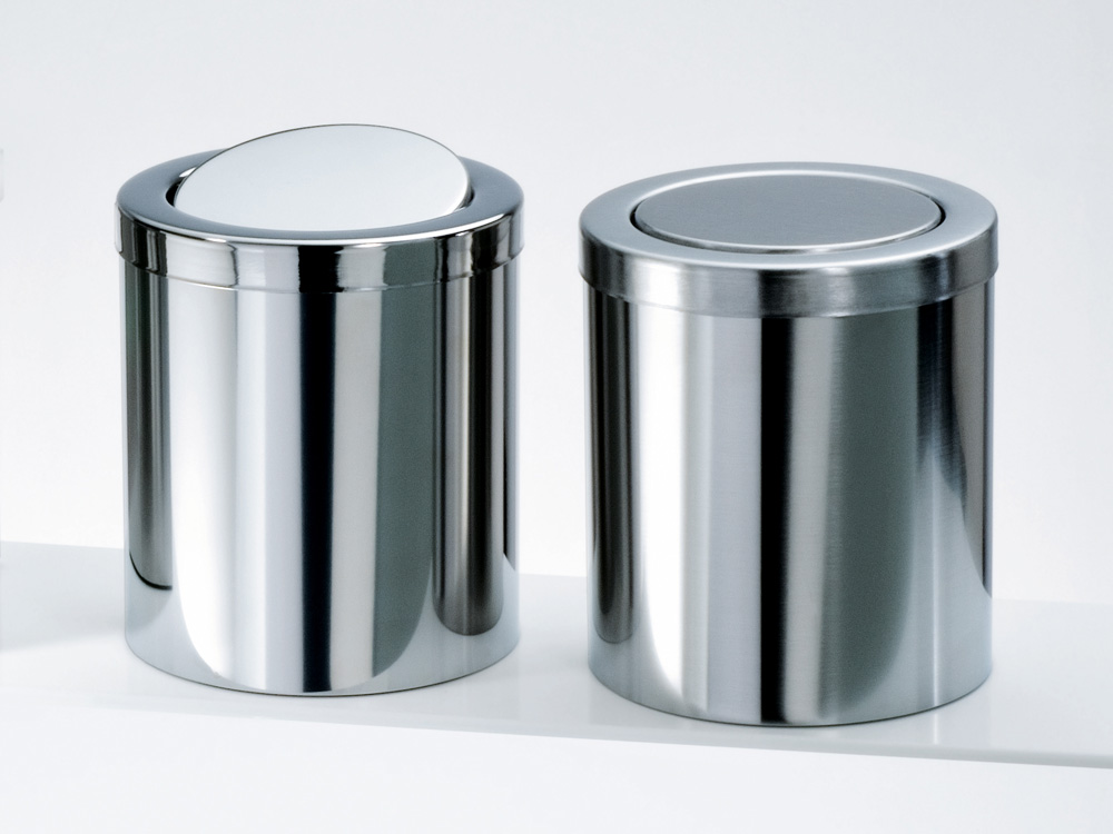 Elegancki nablatowy niewielki kosz na śmieci o cylindrycznym kształcie wykonany z wysokiej jakości stali nierdzewnej w wykończeniu matowym.