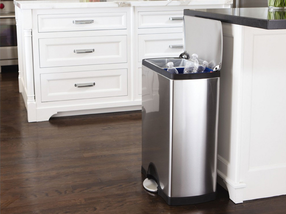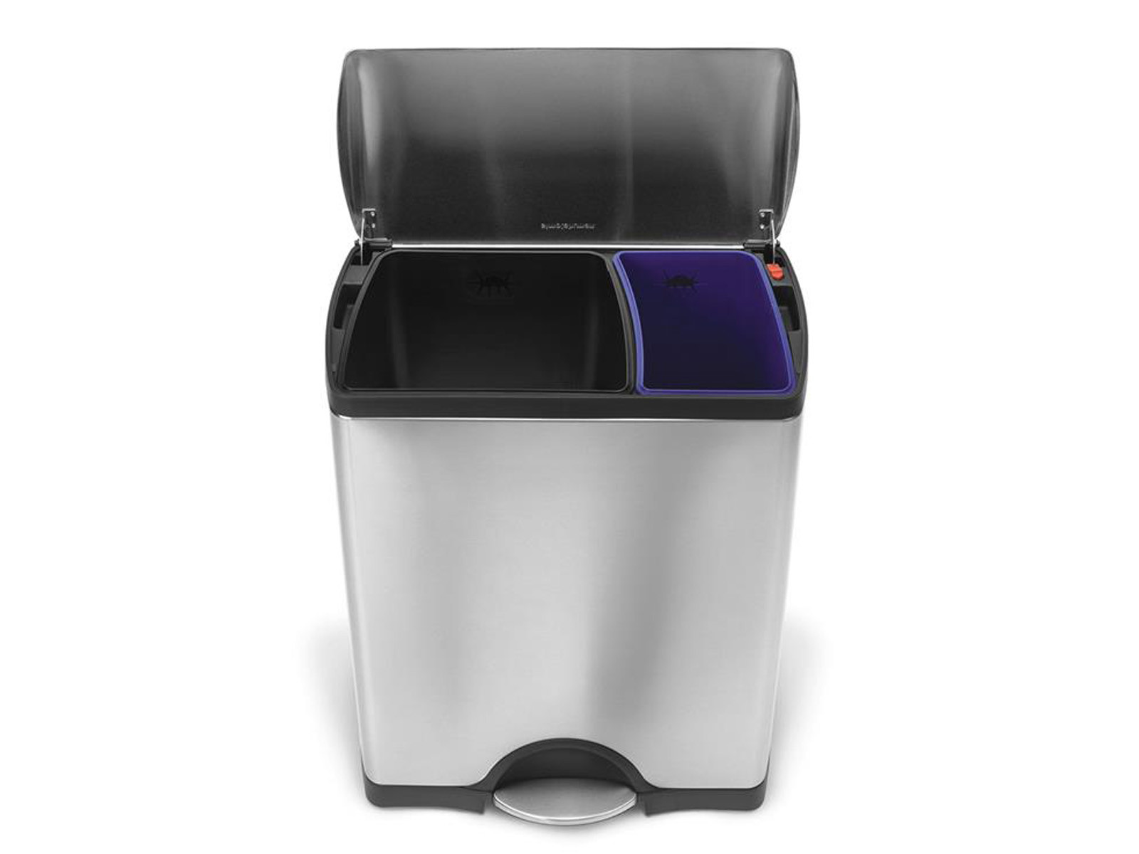Elegancki praktyczny dwukomorowy kosz na śmieci o pojemności 46 litrów z klapą otwieraną poprzez naciskany stopą pedał.