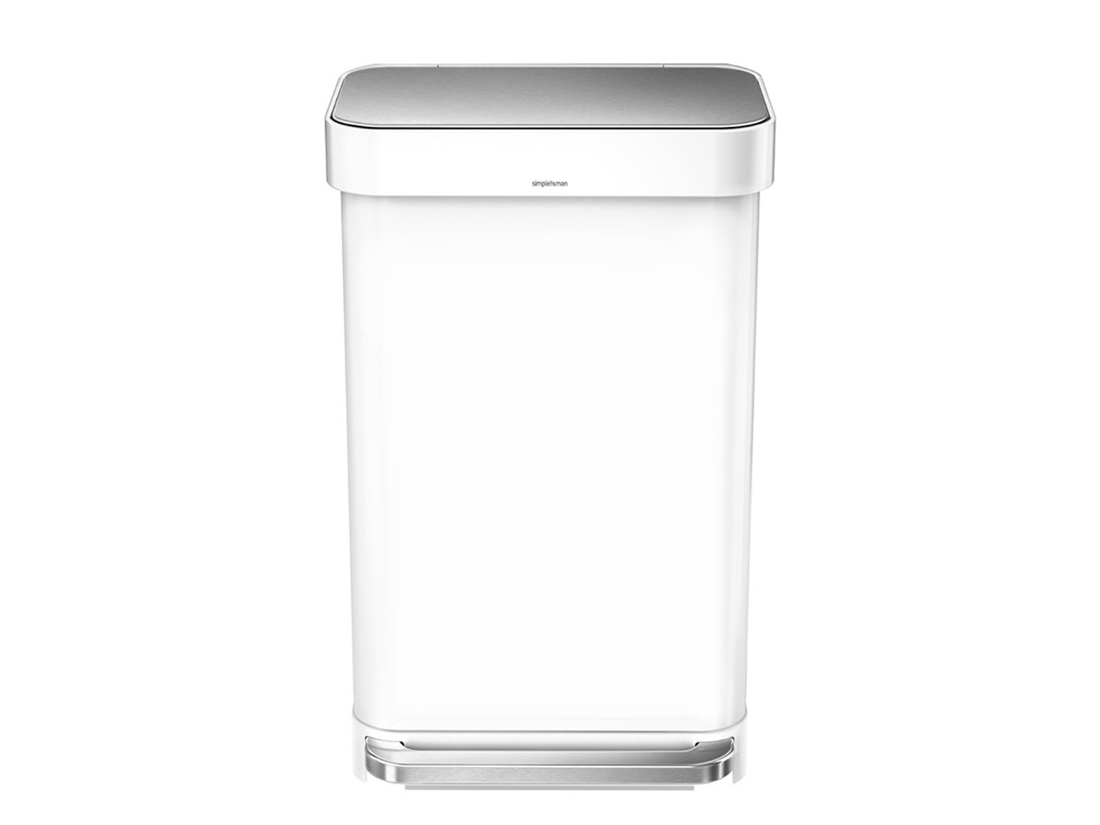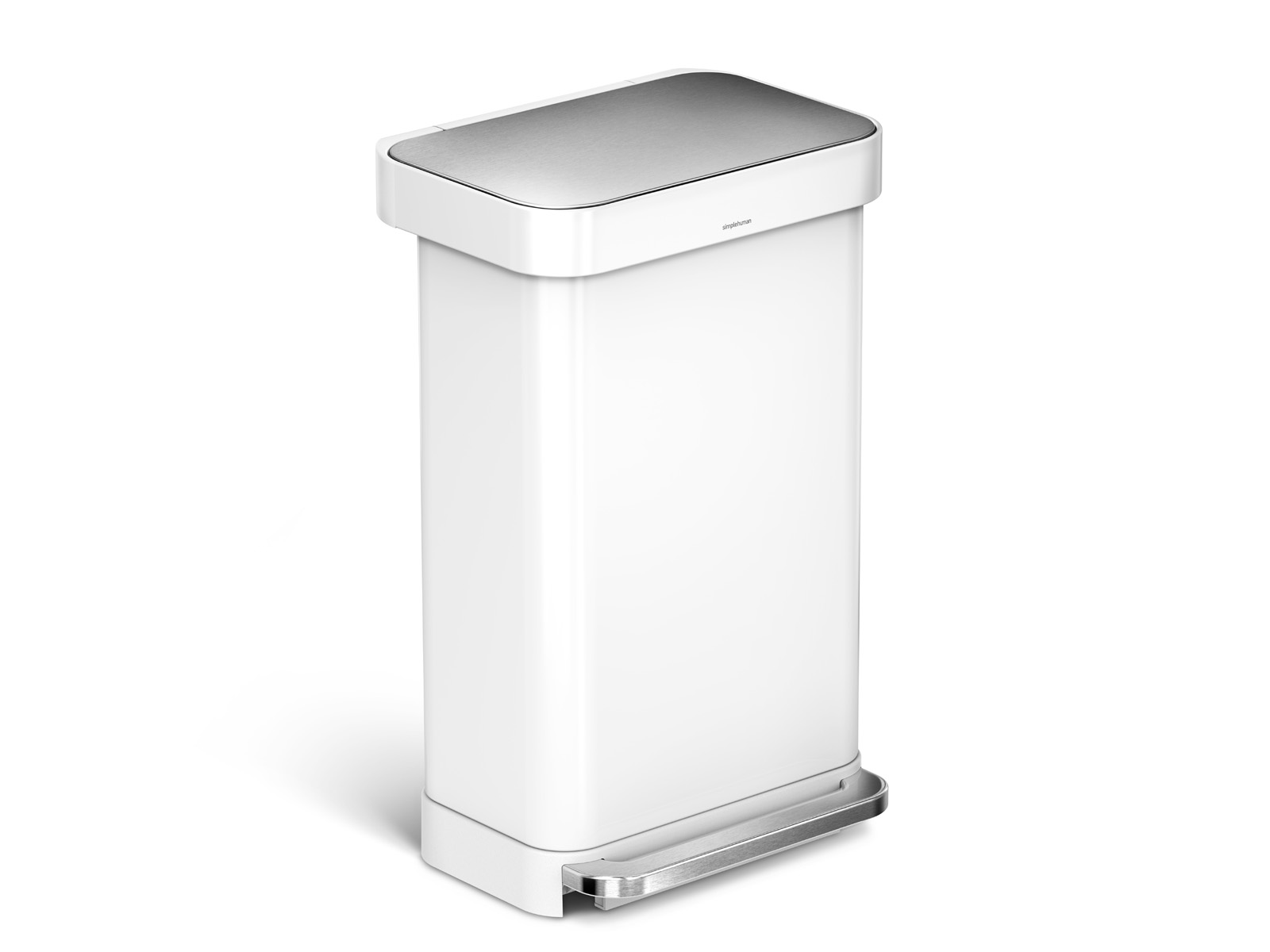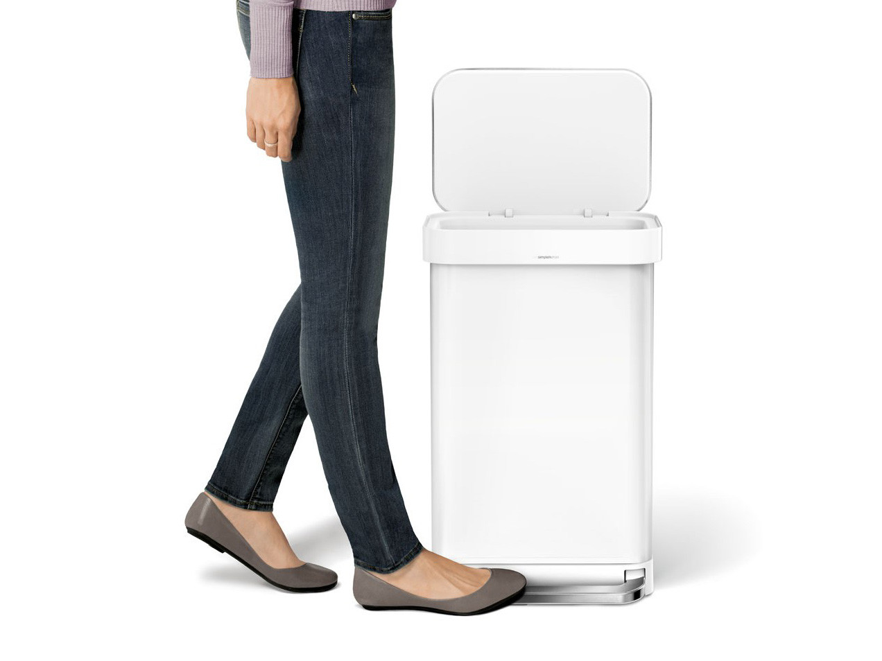 Elegancki duży pedałowy kosz na śmieci o pojemności 45 litrów z klapą otwieraną poprzez naciskany stopą pedał.