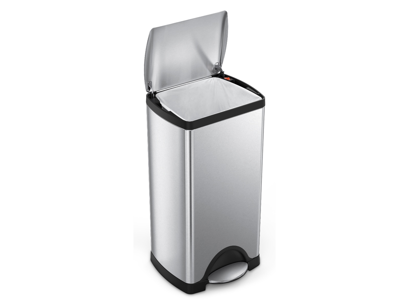 Elegancki, prostokątny kosz na śmieci o pojemności 30 litrów z klapą otwieraną za pomocą pedału nożnego.
