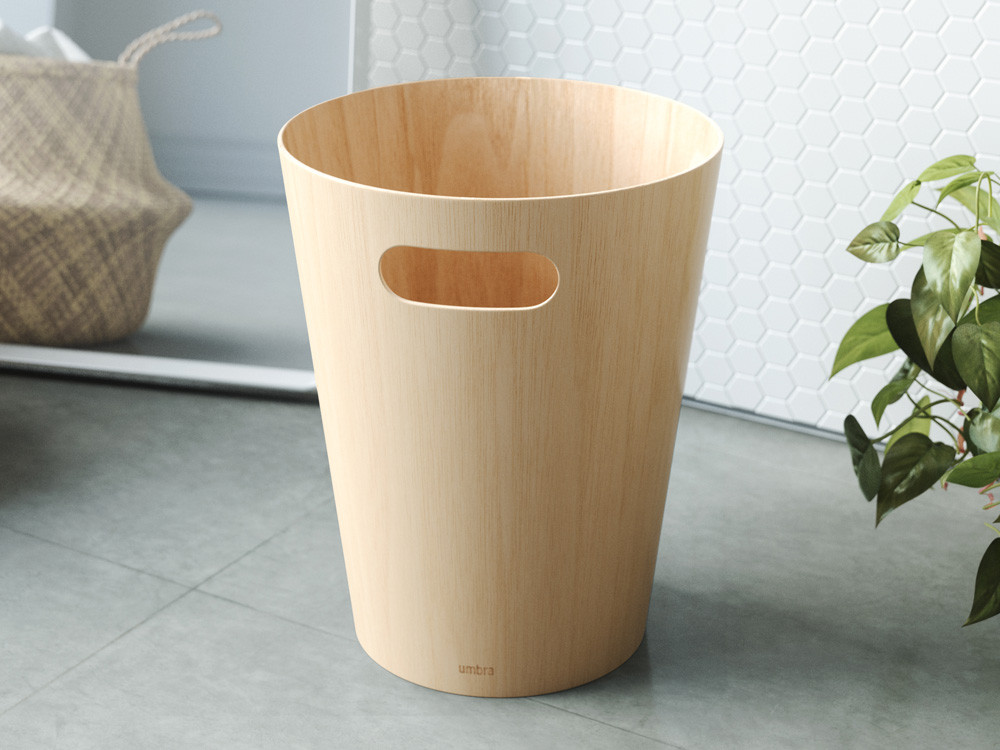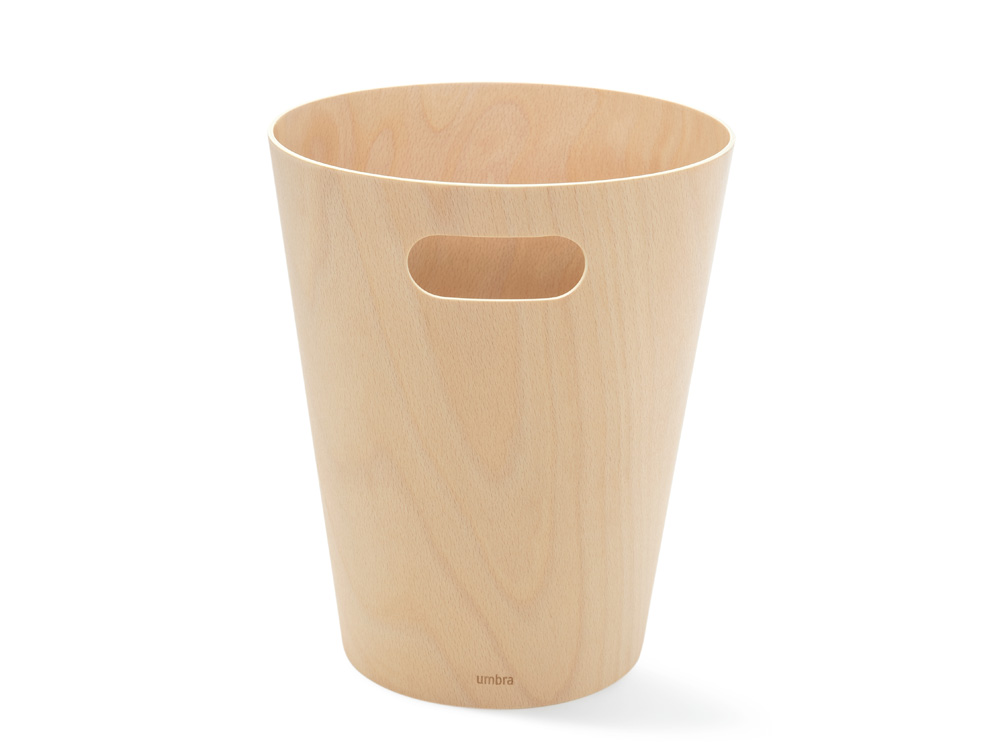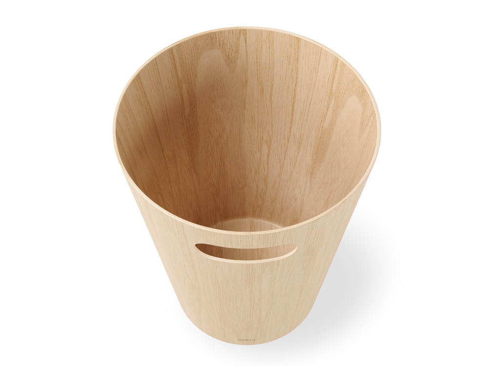 Klasyczny biurowy okrągły kosz na śmieci z wygodnym uchwytem do przenoszenia wykonany z giętej sklejki drewnianej.