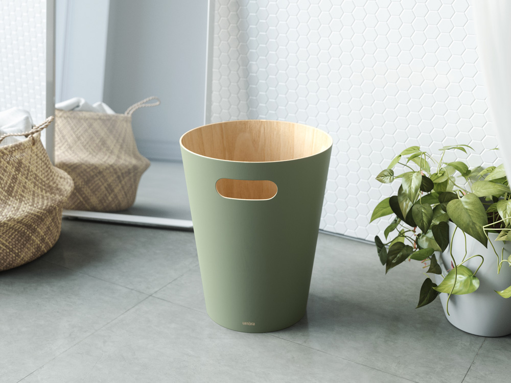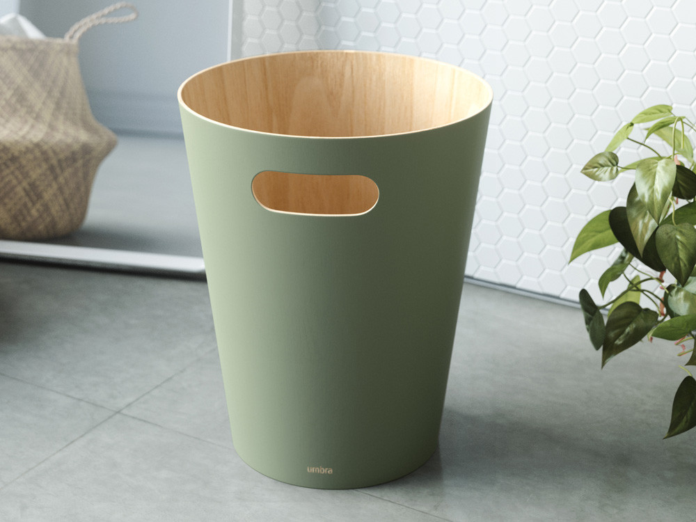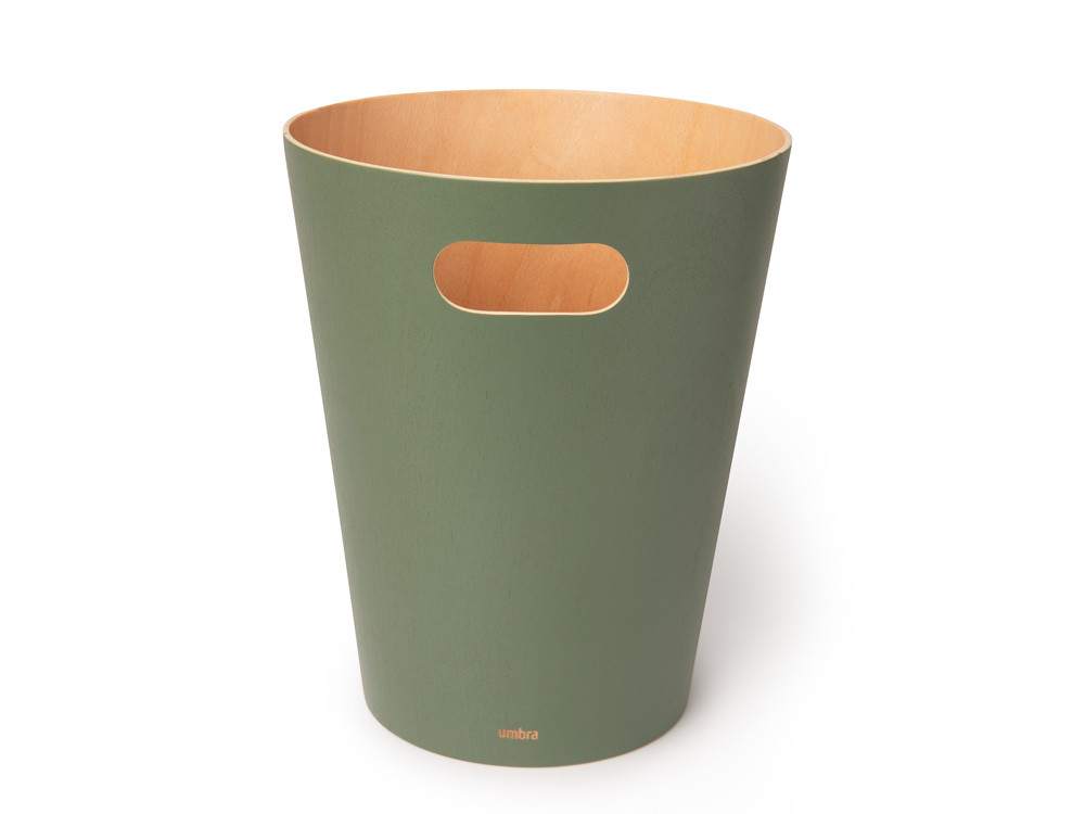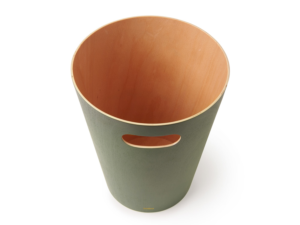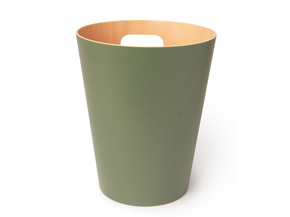 Klasyczny biurowy okrągły kosz na śmieci z wygodnym uchwytem do przenoszenia wykonany z giętej sklejki drewnianej.