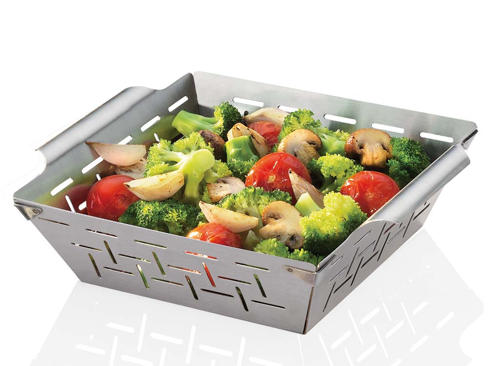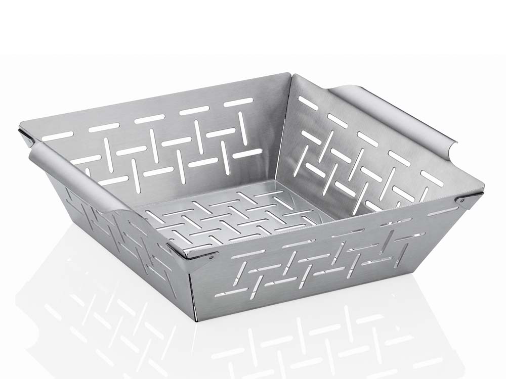 Koszyk dzięki perforowanym ściankom ułatwia równomierną obróbkę cieplną nad ogniem i izoluje, a grilowane produkty przed bezpośrednim działaniem płomieni.