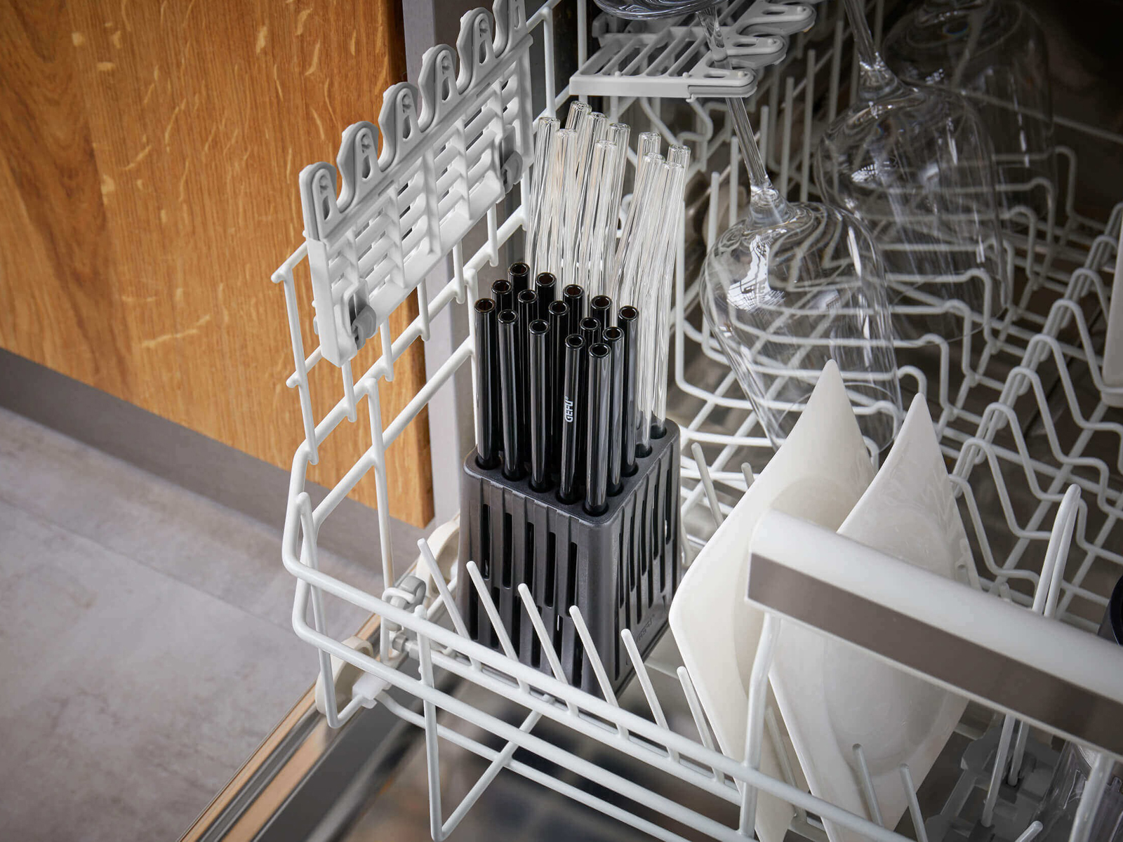Koszyk do zmywarki GEFU Future pomoże zachować porządek i higienę wśród najróżniejszych słomek wielorazowych.