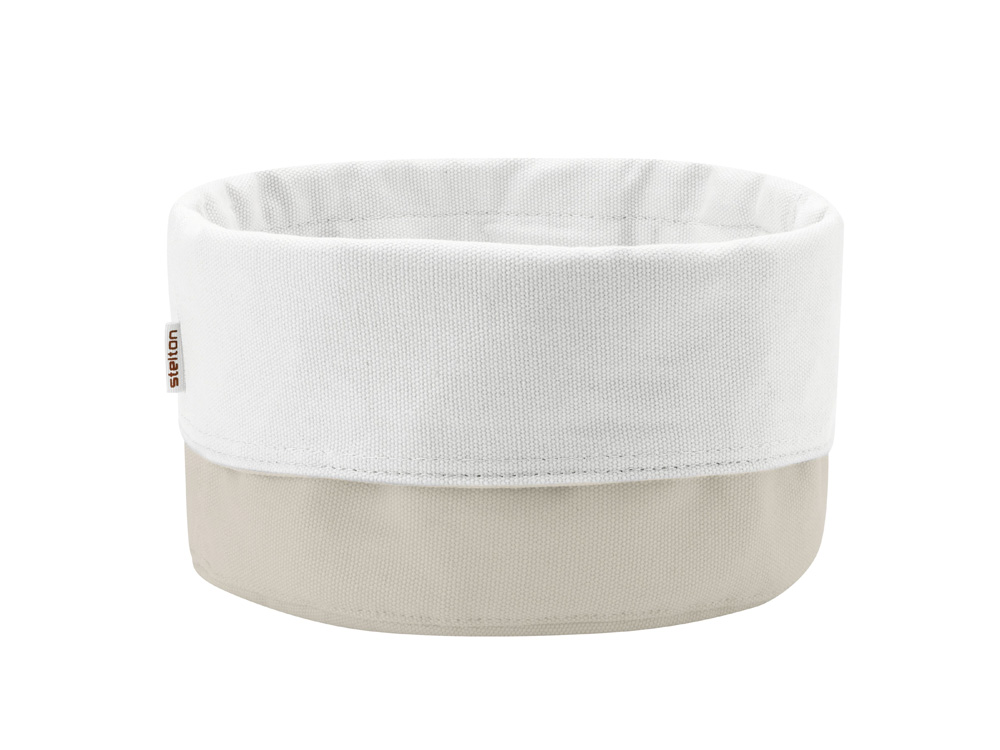 Elegancki i praktyczny dwukolorowy okrągły koszyk na pieczywo wykonany z grubej tkaniny bawełnianej.