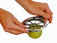 Krajacz z ostrymi ostrzami ułożonymi geometrycznie, kroi jabłko na 8 równych części oraz wycina środek jabłka.