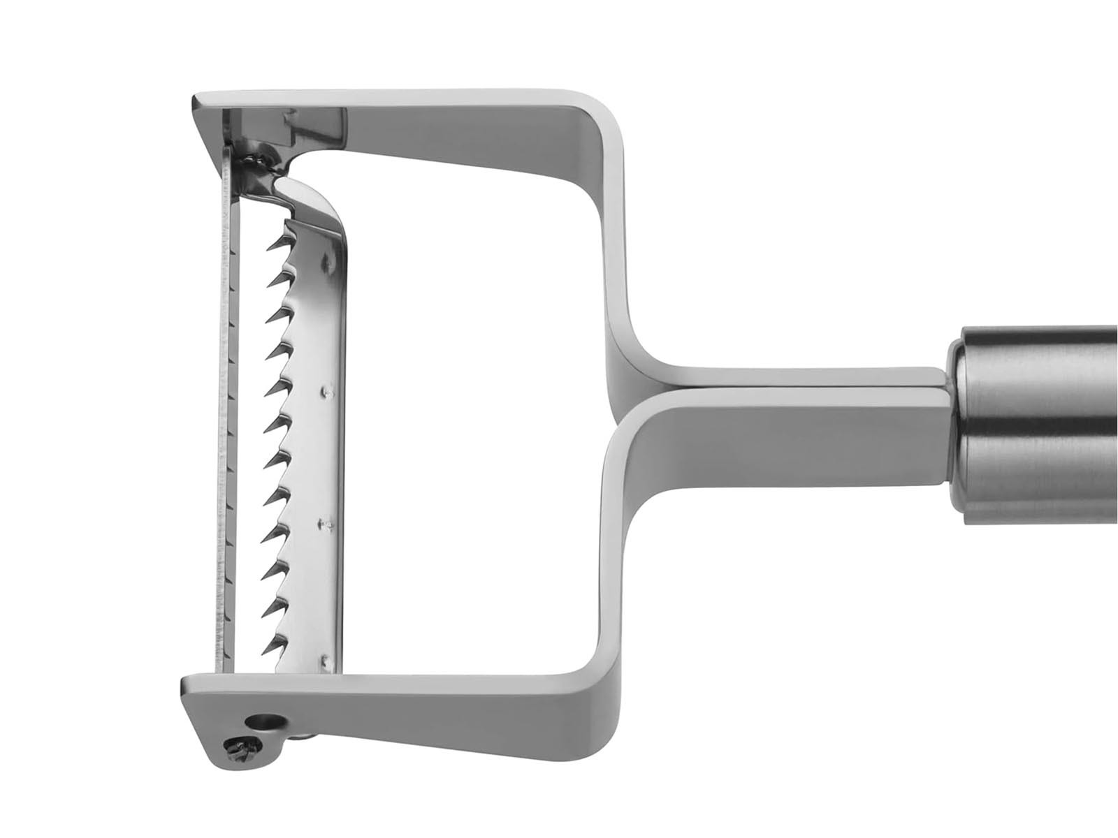Ostre ruchome ząbkowane ostrze umożliwia szybkie cięcie warzyw do zup i sałatek, do smażenia w woku lub prostu do dekoracji talerzy z przekąskami.