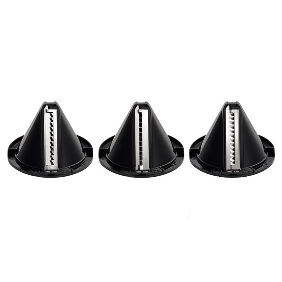 Spiralizer wyposażony w 3 wymienne wkładki o różnej szerokości ostrzy WMF Perfect Cut ze stali nierdzewnej pozwalające na uzyskanie z warzyw spiralnych pasków o różnych grubościach: tagliatelle (ok. 9 mm) linguine (ok. 5 mm) oraz spaghetti (ok. 3 mm).