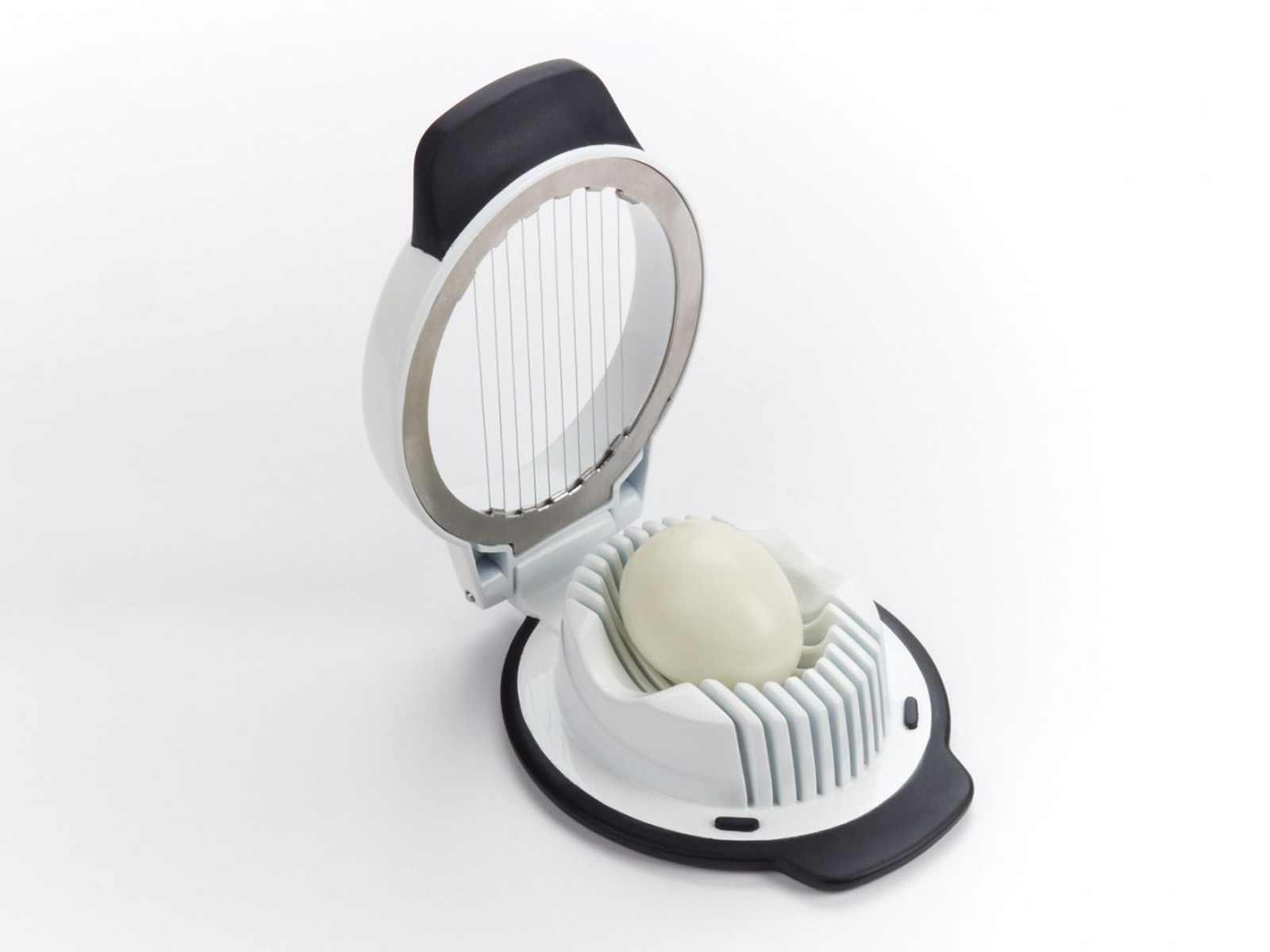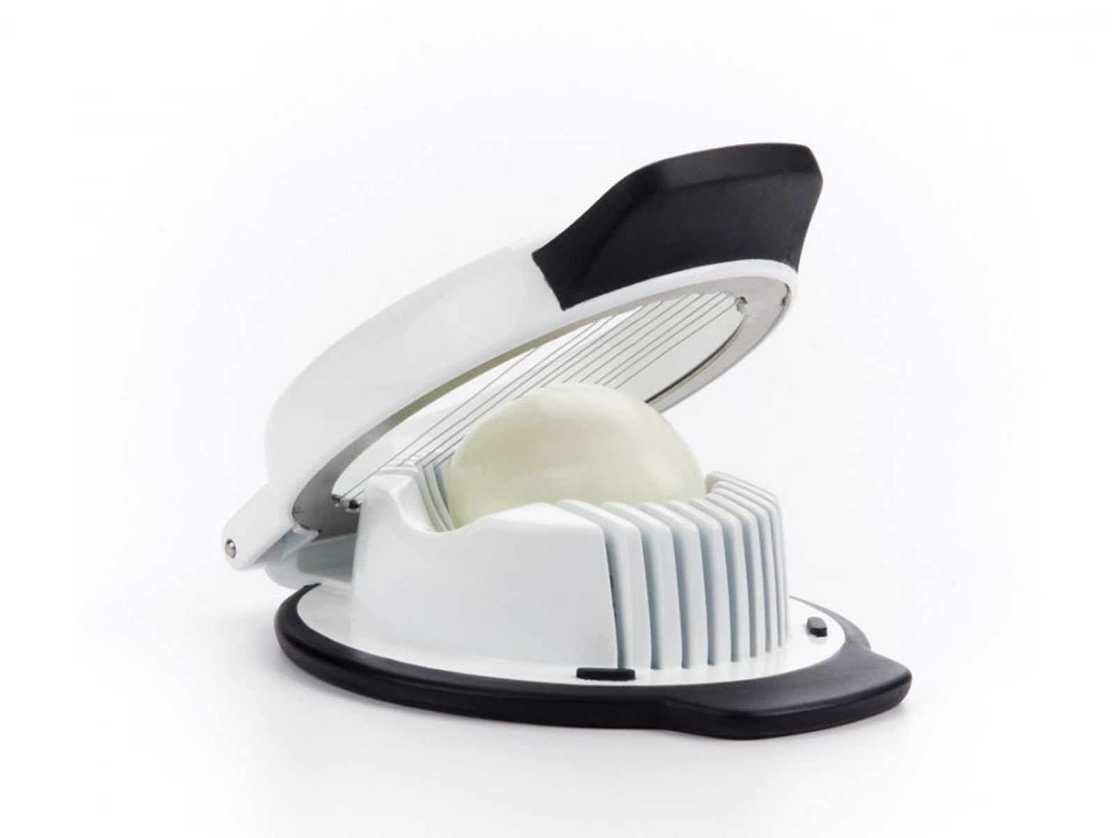Krajalnica posiada 10 naprężonych drucików ze stali nierdzewnej gładko przecinających żółtko i białko na równe plastry o grubości 5 mm.