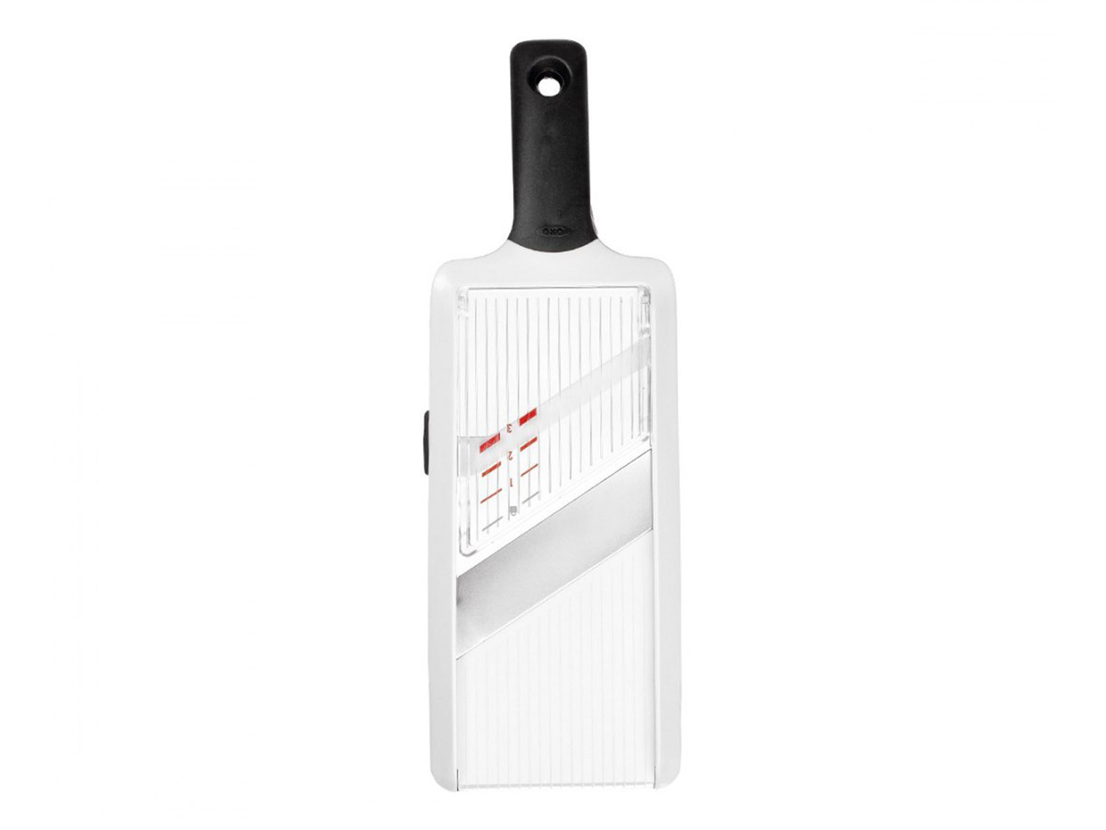 W zestawie z krajalnicą znajduje się zabezpieczający dłonie uchwyt do trzymania warzyw i owoców, który podczas przechowywania krajalnicy pełni rolę ochraniacza ostrza.