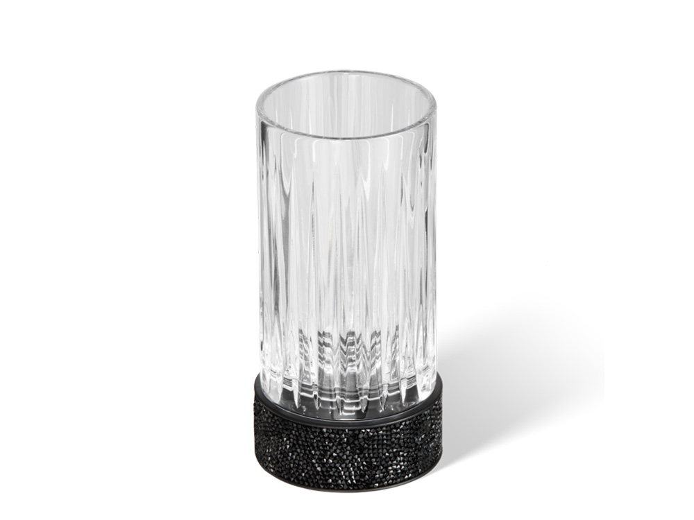 Elegancki okrągły kubeczek wykonany z ciętego przezroczystego bezbarwnego szkła kryształowego z podstawą ozdobioną szerokim pasem gęsto osadzonych kryształków Swarovskiego.