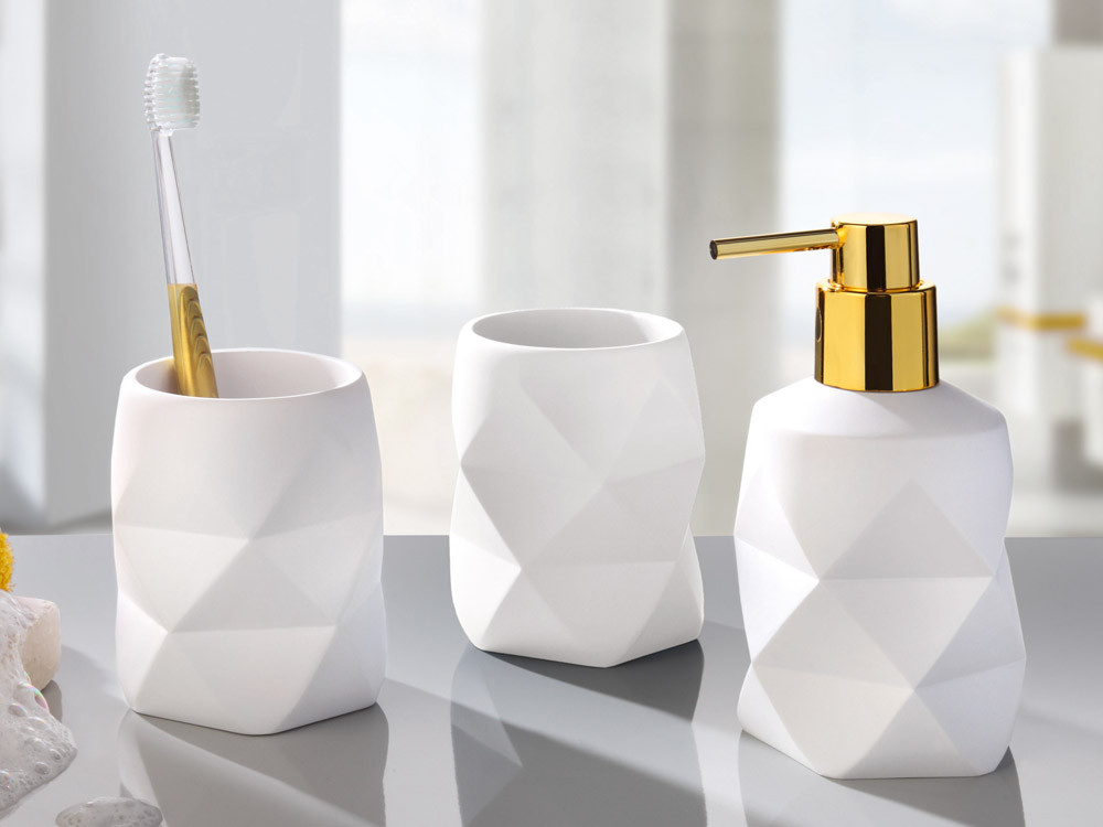 Kolekcja Crackle to bardzo eleganckie i jednocześnie oryginalne akcesoria łazienkowe wykonane z poliresinu o charakterystycznym wzorze. Wzór akcesoriów stanowią łamane trójkąty