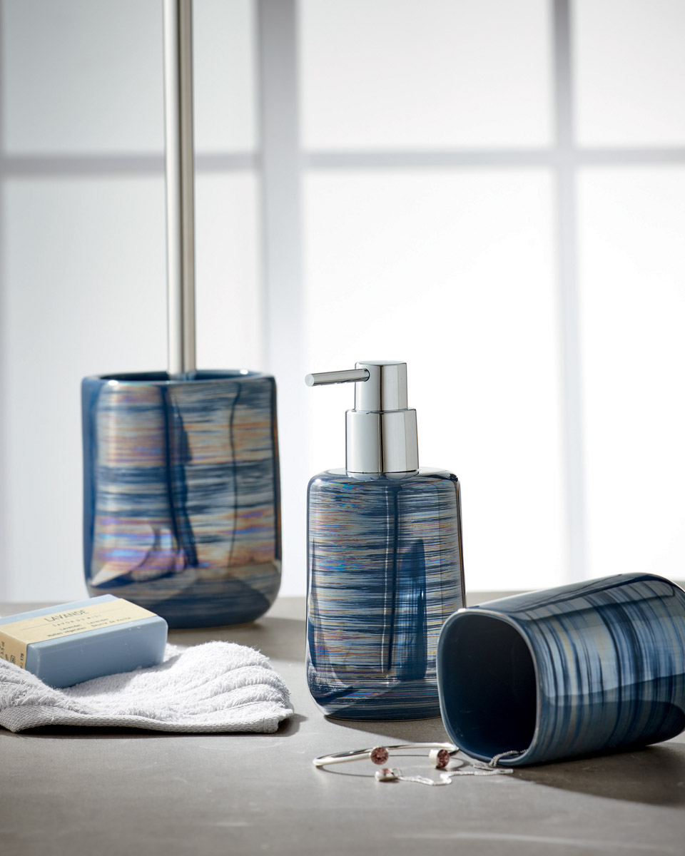 Kolekcja Kleine Wolke Argentic to eleganckie i jednocześnie oryginalne akcesoria łazienkowe wykonane z ceramiki o charakterystycznym wzorze. Wzór akcesoriów stanowi charakterystyczne malowanie w postaci wyrazistych smug na ich powierzchni.