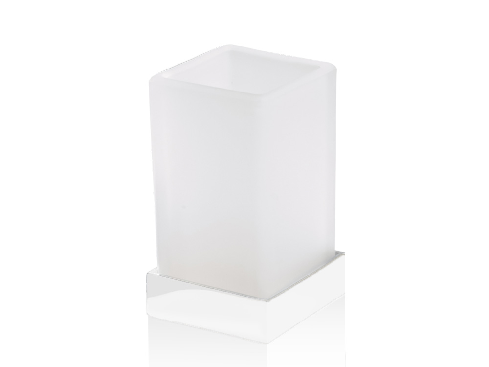 Elegancki prostokątny kubeczek z matowionego białego szkła z podstawą wykonaną z wysokiej jakości lakierowanego mosiądzu w wykończeniu matowym.
