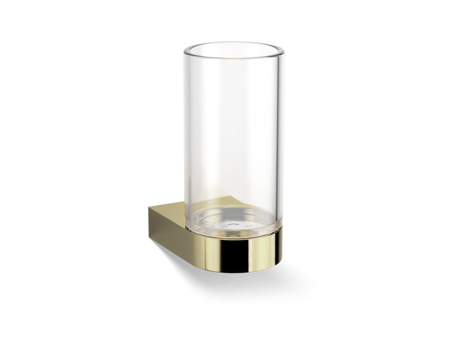 Elegancki okrągły kubeczek łazienkowy wykonany z przezroczystego szkła kryształowego z mosiężną podstawą mocowaną do ściany.