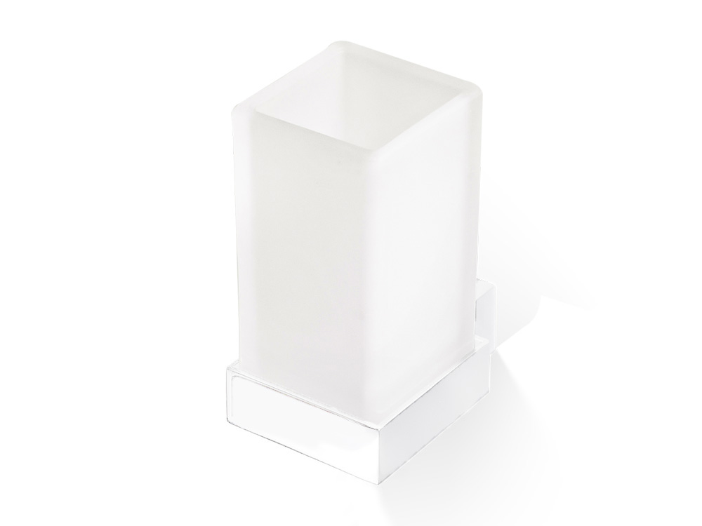 Elegancki prostokątny kubeczek łazienkowy wykonany z matowionego białego szkła z mosiężną podstawą mocowaną do ściany.