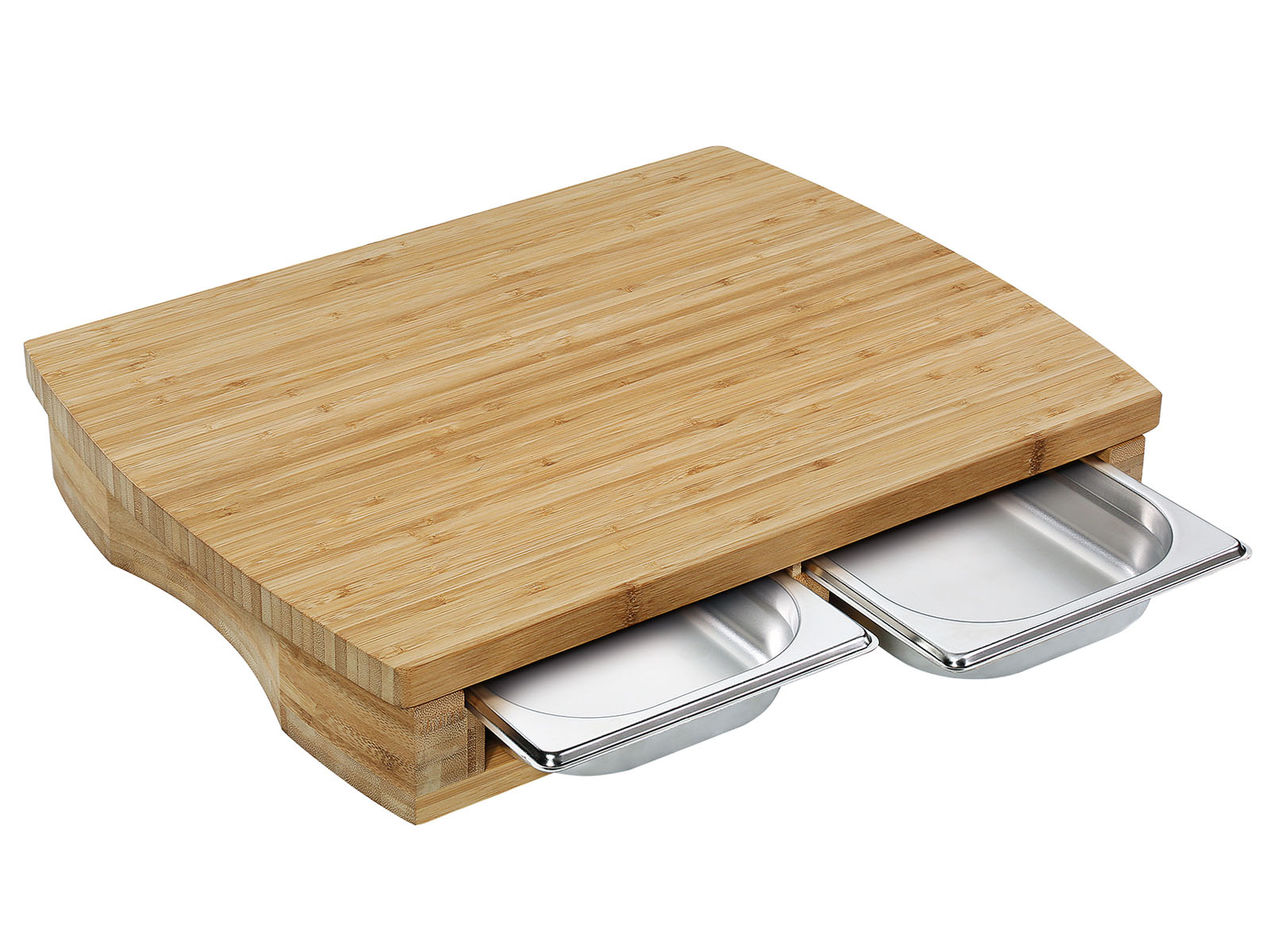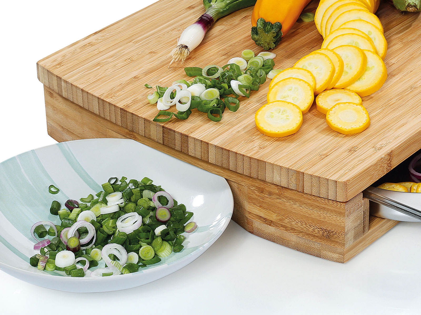 Zassenhaus All In One to kolekcja oryginalnych desek i bloków do krojenia z wbudowanymi tackami roboczymi. All In One to uniwersalne deski, które pozwolą zachować porządek podczas krojenia wszelkiego rodzaju składników. Wysuwane tacki mogą posłużyć do zsuwania pokrojonych produktów lub odkrojonych resztek. Wcięcia po bokach ułatwiają przenoszenie, mogą posłużyć także do wygodnego dopasowania talerza lub płaskiej miski, aby zmniejszyć ryzyko rozsypania produktów podczas zsuwania. Powierzchnia robocza deski jest zdejmowana i może posłużyć samodzielnie do krojenia i serwowania.