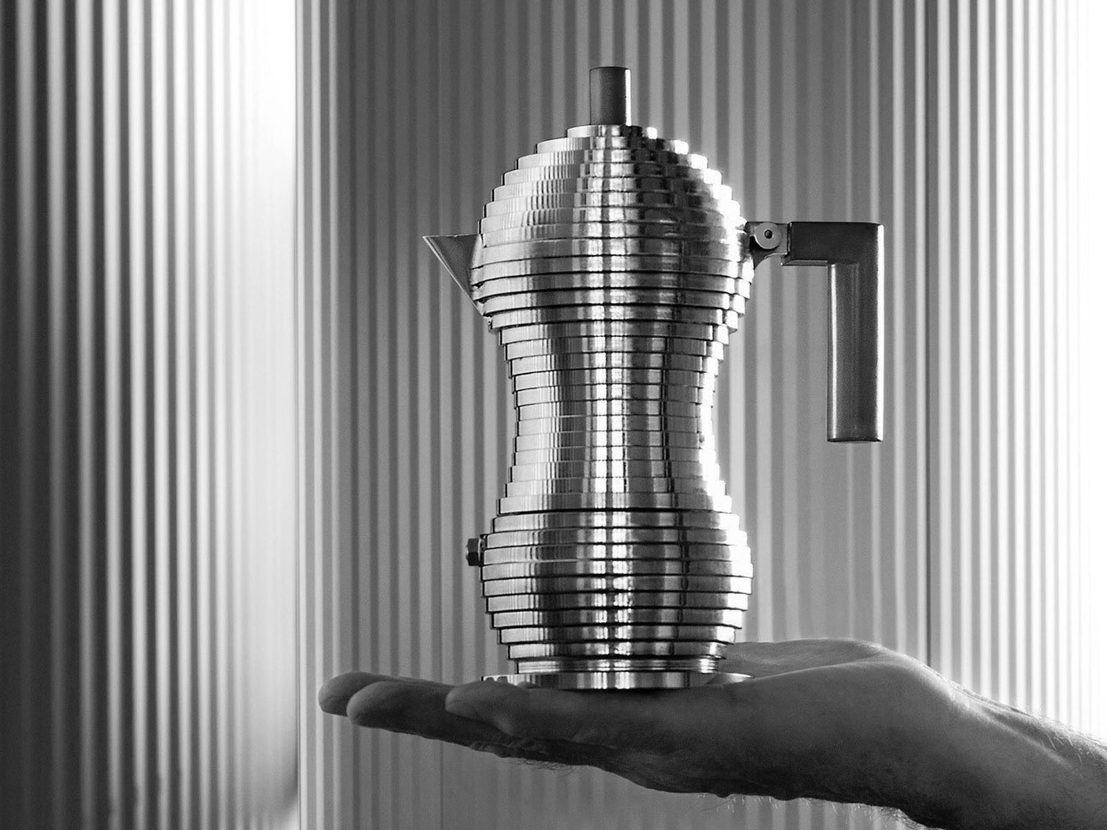 Projekt kawiarki, podobnie jak inne realizacje marki Alessi, w harmonijny sposób łączy dopracowaną kompozycję z klasyczną i praktyczną funkcjonalnością.