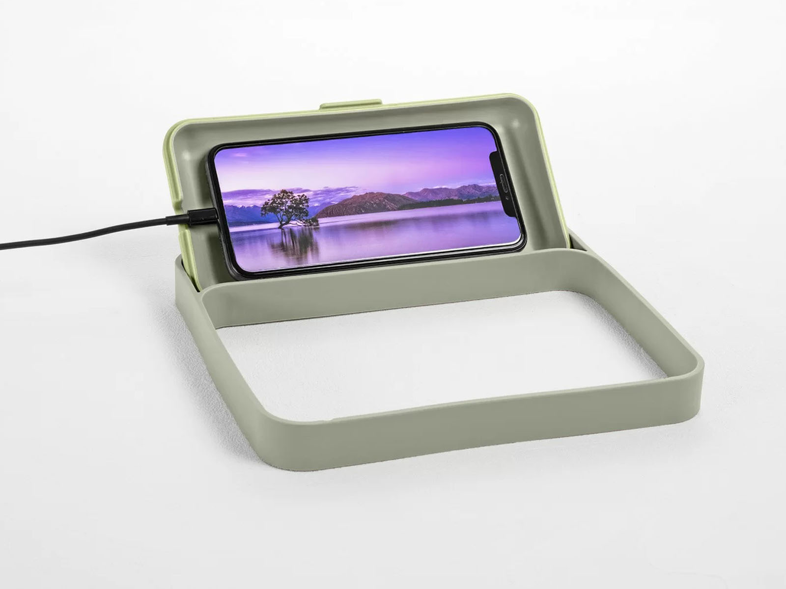 - hermetyczna pokrywa (100% szczelności) z otworem na słuchawki lub kabel do ładowania smartfona jest zarazem stabilną podstawką pod telefon