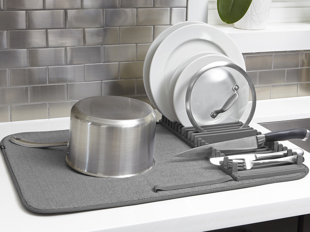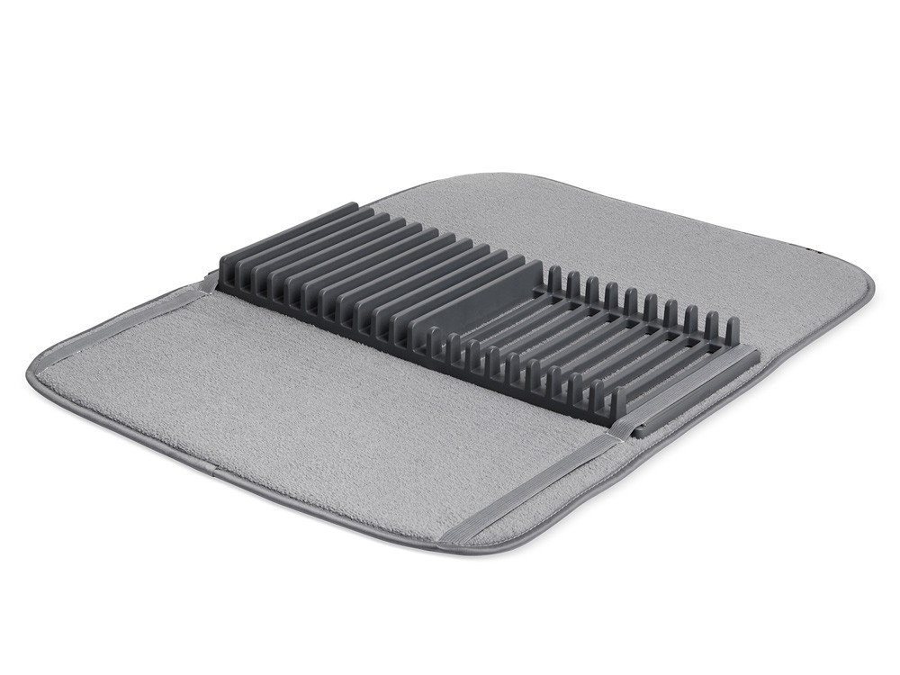 Podręczna prostokątna składana mata do suszenia naczyń z ociekaczem na talerze 2w1. Mata wykonana ze specjalnego szybkoschnącego materiału z niewielkim ociekaczem w formie żeberkowej podstawki z tworzywa sztucznego.