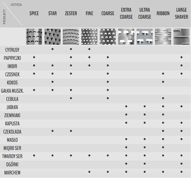 Nakładka pasuje do wszystkich tarek Gourmet z wyjątkiem najszerszej tarki ULTRA COARSE.