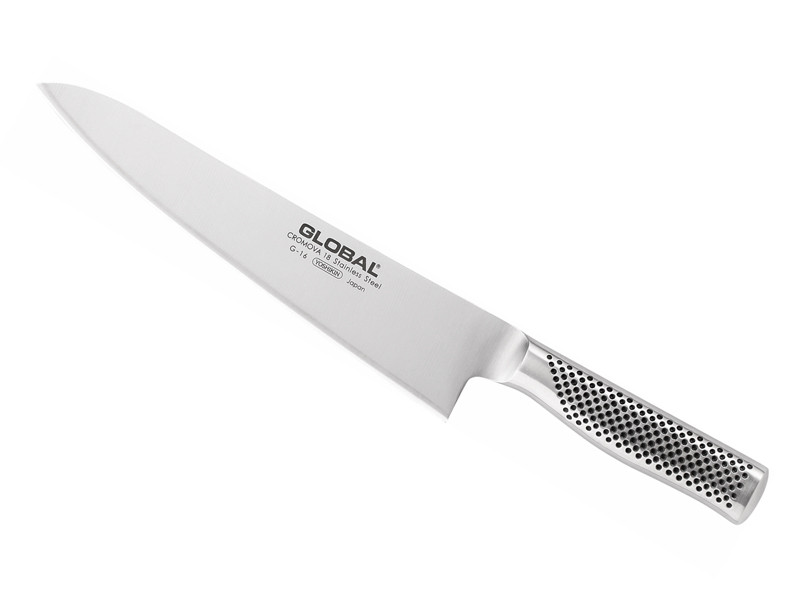 Global Cromova 18 G-16 to ekskluzywny profesjonalny nóż szefa kuchni. Jest to wszechstronny nóż, który doskonale się sprawdza podczas rozmaitych kuchennych zadań, również tych, które wymagają dłuższej krawędzi tnącej. Szerokie, cienkie ostrze szybko i dokładnie kroi większe produkty, np. warzywa dyniowate czy arbuzy, co pozwala zaoszczędzić cenny czas. Nóż jest lekki i fenomenalnie wyważony - w rączce posiada piasek, który przesypuje się i pomaga podczas pracy.