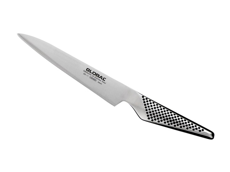 Global Cromova 18 GS-11 to ekskluzywny profesjonalny elastyczny nóż uniwersalny. Jest to poręczny, wszechstronny nóż przeznaczony głównie do krojenia miękkich produktów, który może także posłużyć jako nóż do filetowania lub porcjowania. Niezwykle cienkie, elastyczne ostrze ułatwia manewrowanie podczas zadań wymagających dużej zręczności, a pełnowymiarowa rękojeść pozwala skutecznie kontrolować ruchy. Nóż jest lekki i fenomenalnie wyważony - w rączce posiada piasek, który przesypuje się i pomaga podczas pracy.