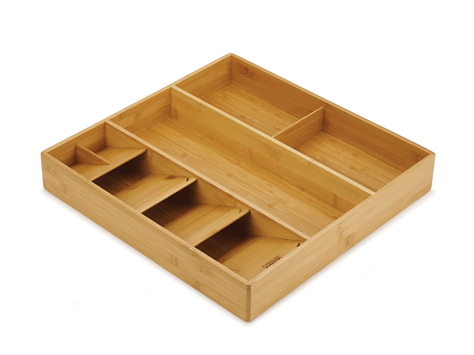 Organizer wykonany z naturalnego drewna bambusowego z 3-ema dużymi przegródkami na większe przybory kuchenne oraz ze specjalnie zaprojektowanymi ułożonymi pod kątem 5-oma przegródkami na sztućce.