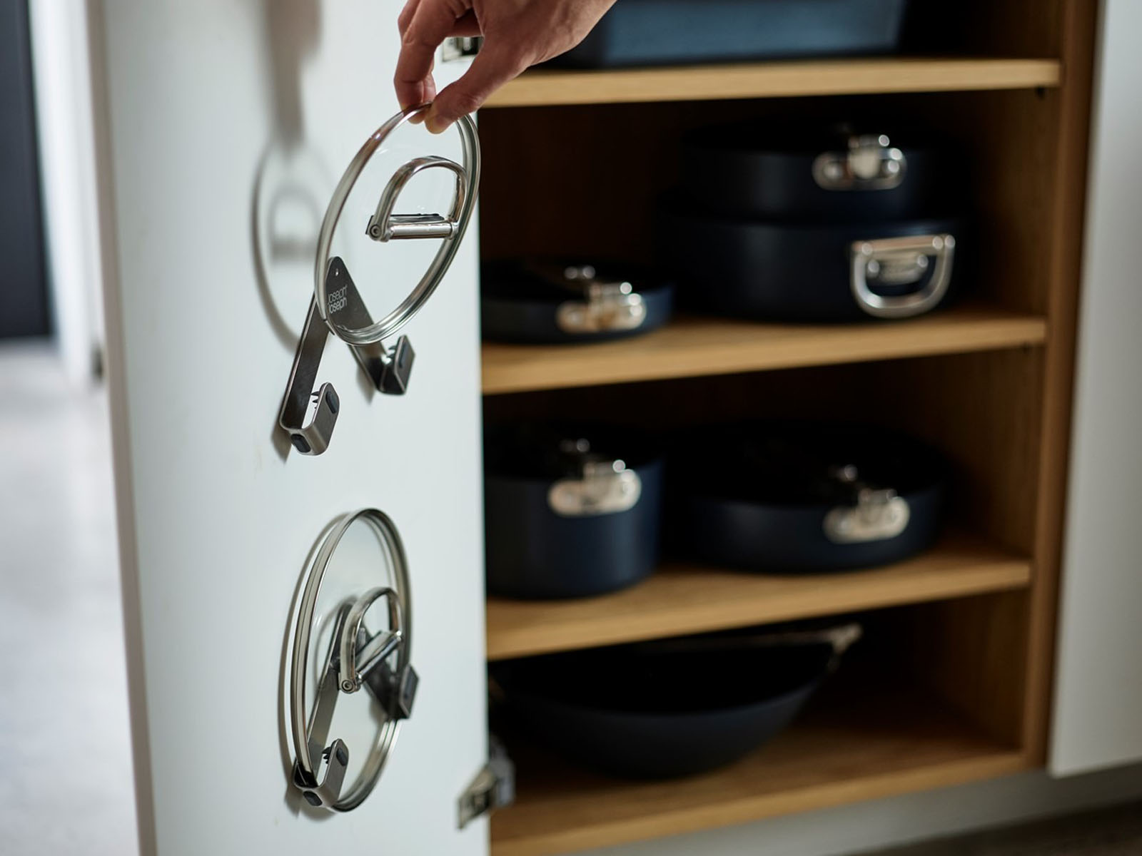 Zestaw organizerów-wieszaków Joseph Joseph Space pozwala lepiej wykorzystać przestrzeń i uporządkować pokrywki do garnków i patelni.