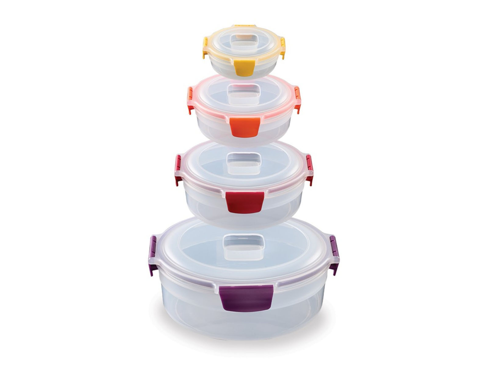 Elegancki zestaw hermetycznych pojemników kuchennych do przechowywania żywności. Komplet zawiera 4 okrągłe pojemniki o pojemnościach: 1,6 litra, 1 litr, 0,67 litra oraz 0,38 litra oraz 4 prostokątne pojemniki o pojemnościach: 1,85 litra, 1,1 litra, 0,54 litra oraz 0,23 litra. Materiał wykonania jest wolny od BPA.