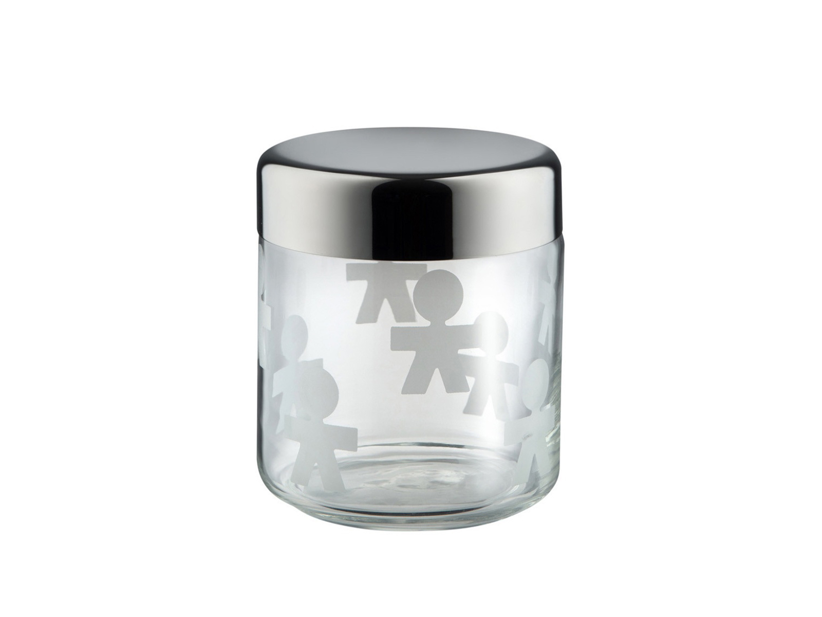 Ozdobny pojemnik z kolekcji Girotondo przykuwa uwagę motywem ludzików, naniesionym na ścianki metodą sitodruku. Pojemnik wykonany jest ze szkła, natomiast hermetyczna pokrywka – ze stali nierdzewnej polerowanej na lustro. Dekoracje z postaciami, charakterystyczne dla całej kolekcji, dodają naczyniu lekkiego, humorystycznego akcentu.
