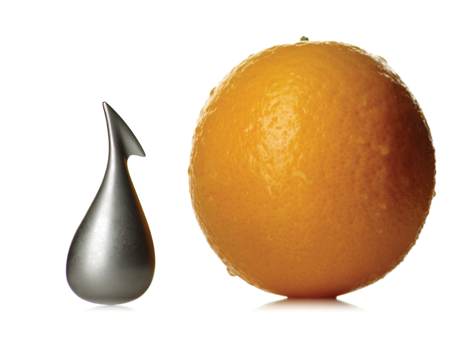 Apostrophe to niewielka obieraczka do pomarańczy, zaprojektowana z myślą o precyzyjnym nacinaniu skórki bez uszkadzania miąższu. Haczykowate ostrze tnące działa jak zwinny pług – jego rozmiar wyznacza odpowiednią głębokość cięcia, dopasowaną do grubości skórki. Pozwala to nie tylko łatwo obrać owoc, lecz także tworzyć dekoracyjne wzory na jego powierzchni.