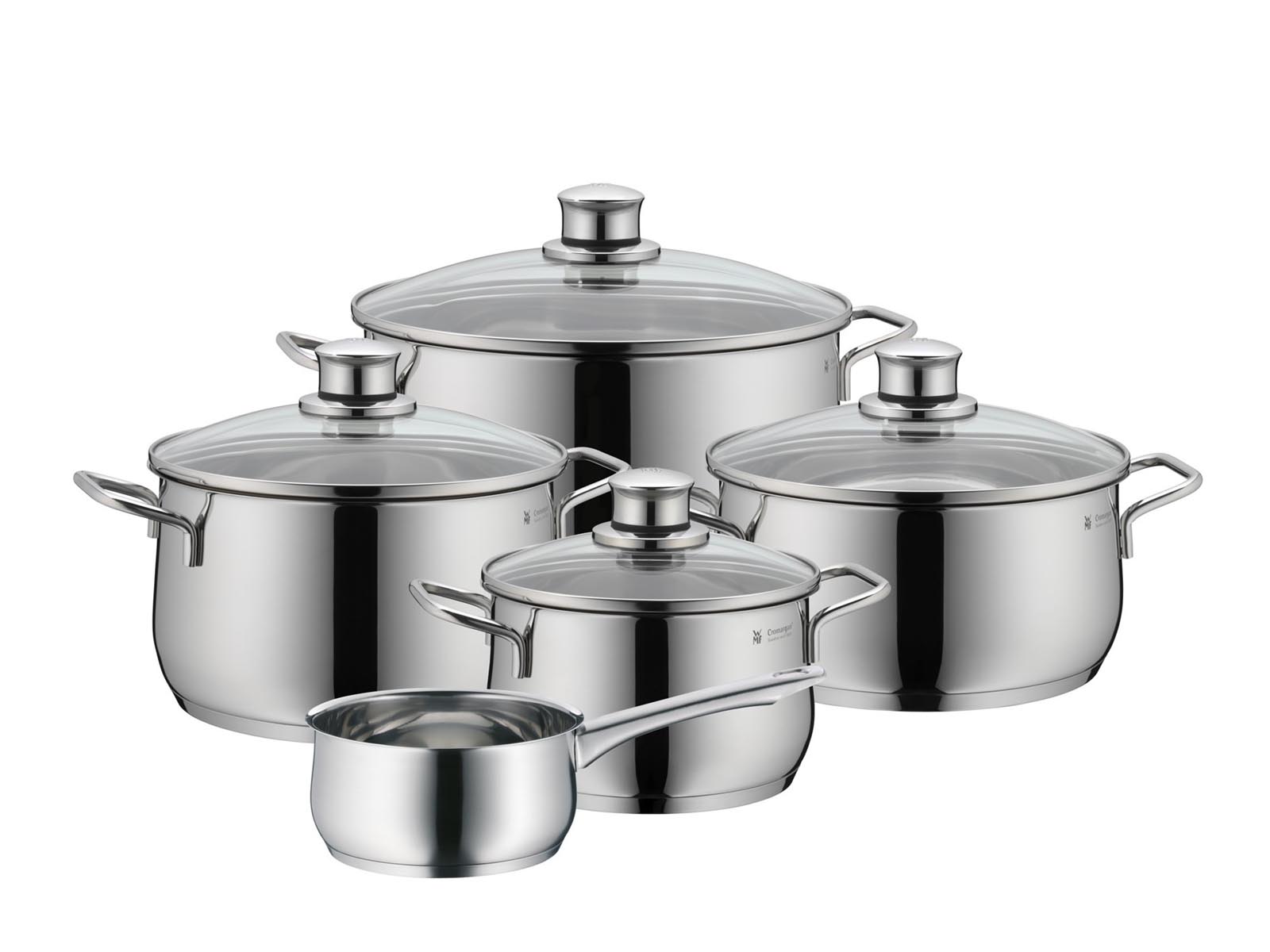 Zestaw 5-ciu eleganckich i solidnych garnków z 4-ema dopasowanymi do nich pokrywkami z linii Diadem Plus z charakterystycznym wybrzuszeniem przy podstawie garnków.